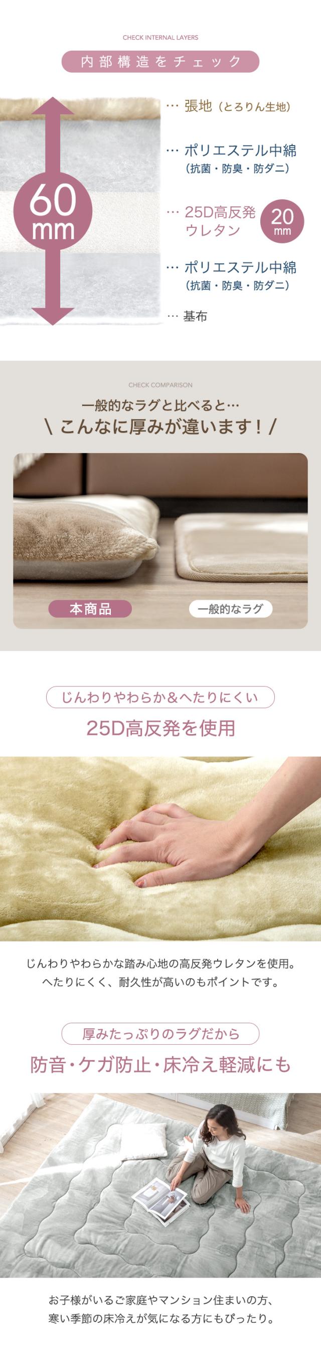 ラグ 超極厚60mm とろりんラグ 200×250 3畳 とろけるような肌触り 極細マイクロファイバー ホットカーペット対応 ラグ ラグマット 高反発ラグ フランネルラグ 高反発 ウレタン 厚手 極厚 防音 滑り止め 長方形 抗菌 防臭 防ダニ おしゃれ【商品番号:65010010】