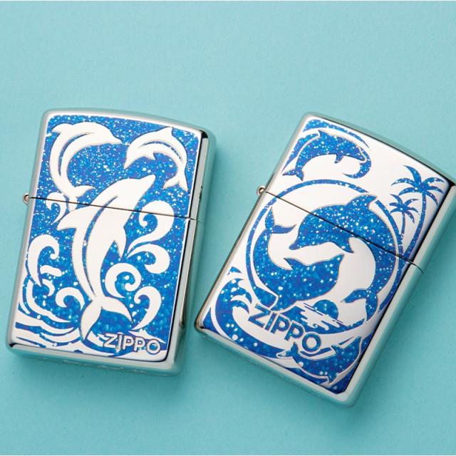 重みのあるアーマーベースに特殊なプリント加工で施したラメ入りのかわいいイルカやヤシの木が温かな雰囲気で魅力的なZIPPOライター。