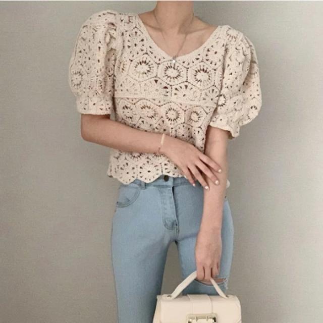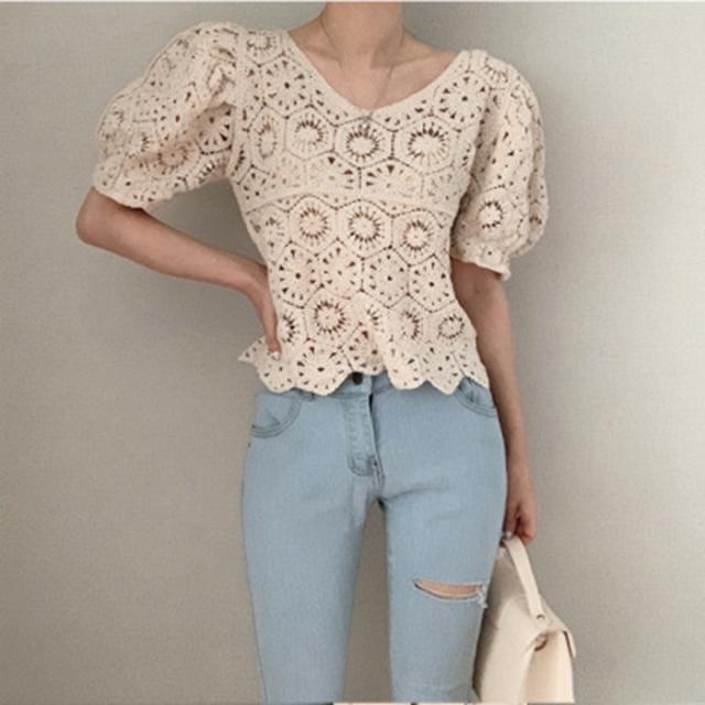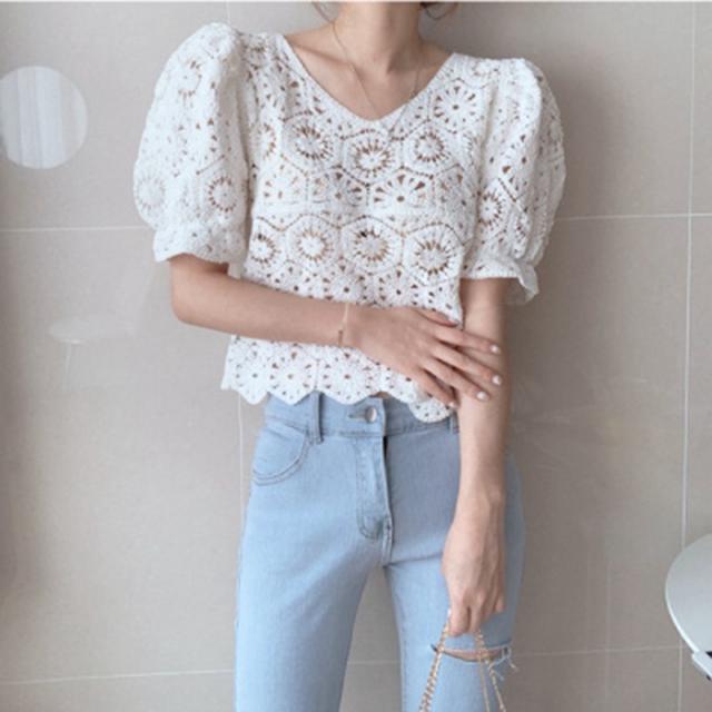 シャツ ブラウス レースブラウス Vネック 透け感 パフスリーブ ブラウス トップス