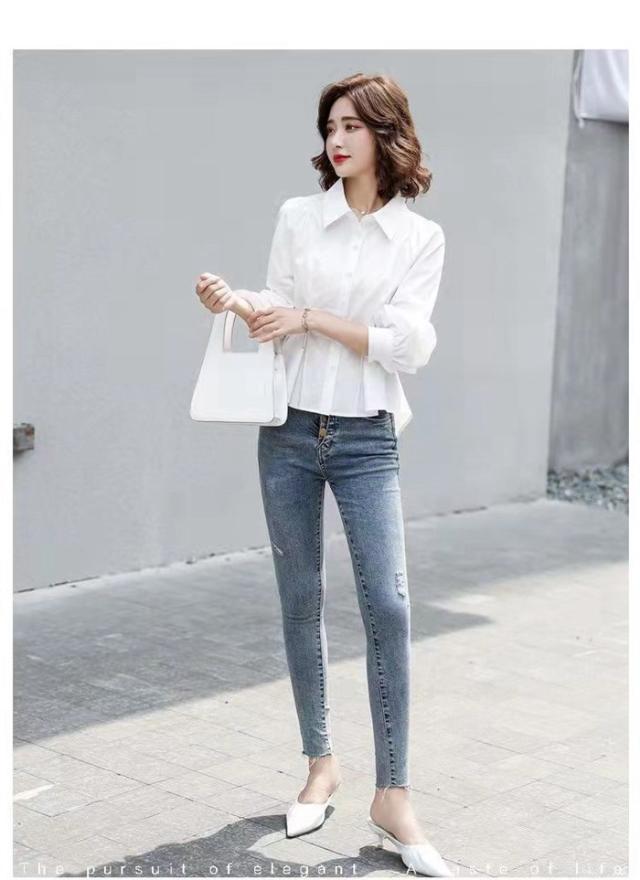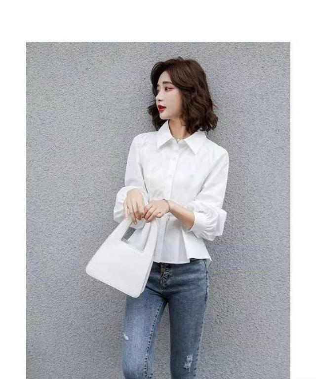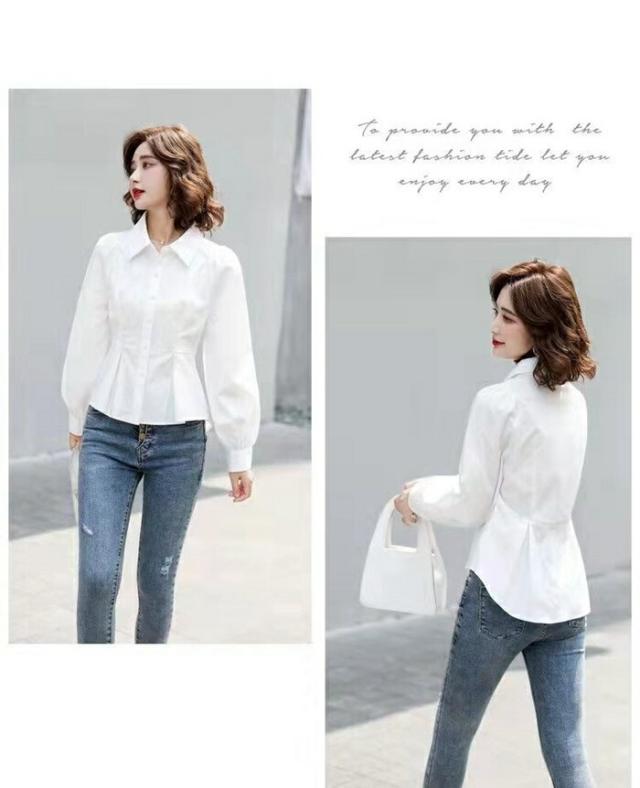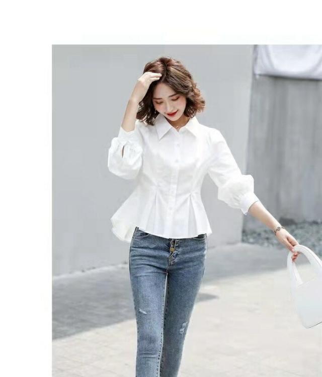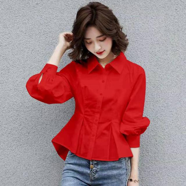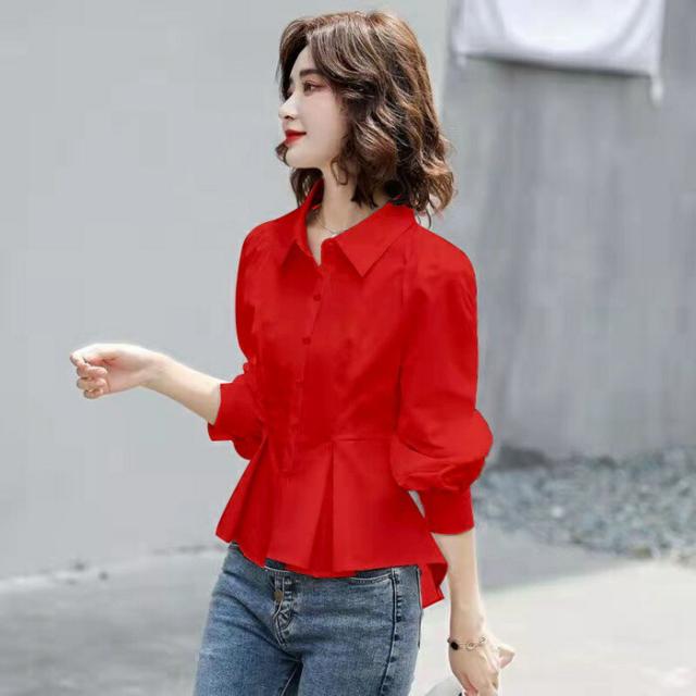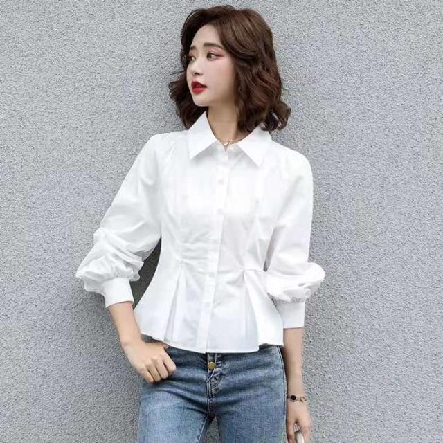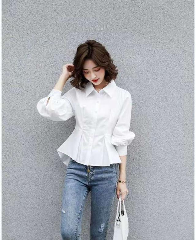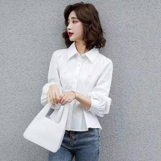 シャツブラウス 長袖 レディース ボリューム袖 シンプル パフスリーブ ペプラム トップス Aライン 体型カバー シンプル 無地