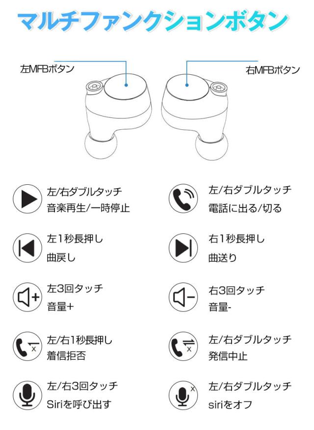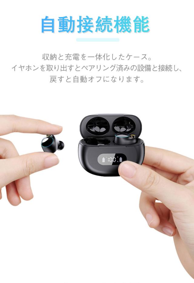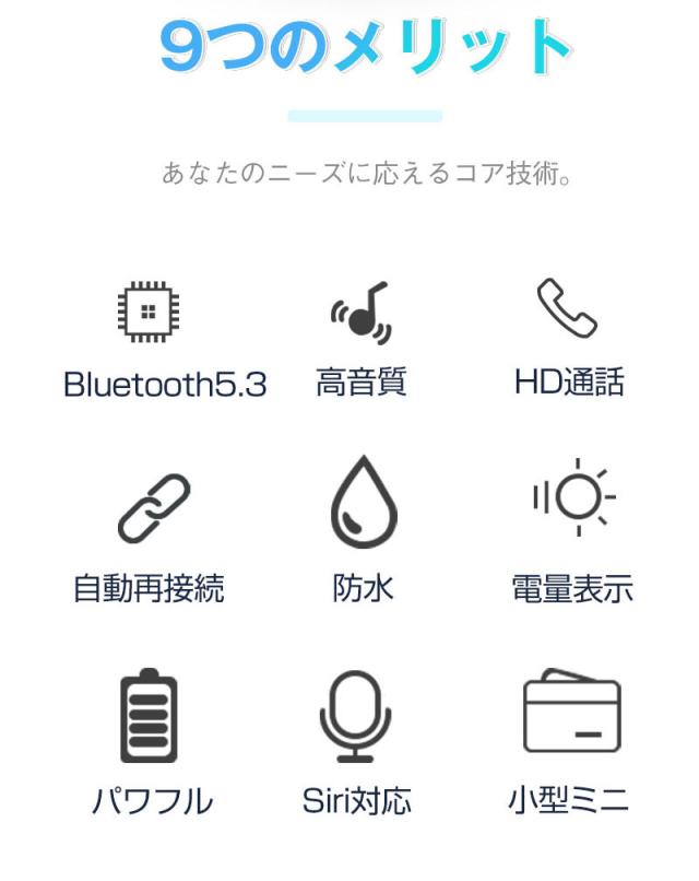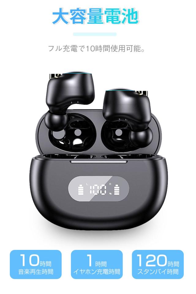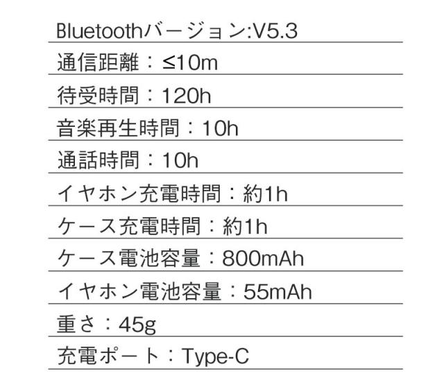 【その他の特徴】片耳・両耳モード対応、USB充電、800mAh大容量充電ケース、デジタル表示、Siri・音声アシスタント対応、タッチ操作、幅広い互換性、10時間音楽再生・通話。