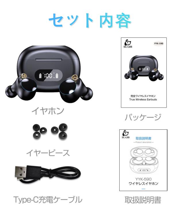 充電ケース+イヤホン本体、イヤーピースセット、Type-C充電ケーブル、日本語取扱説明書。