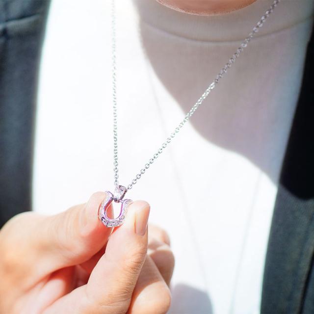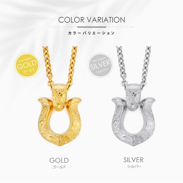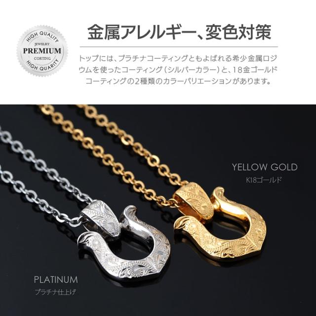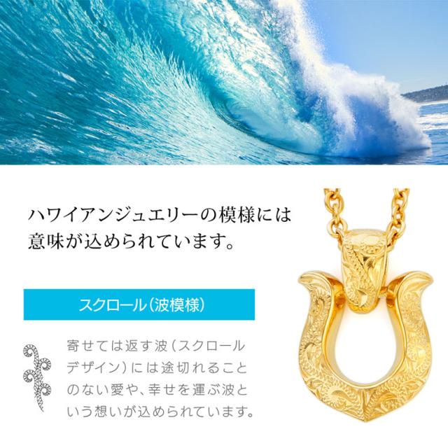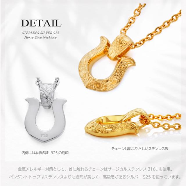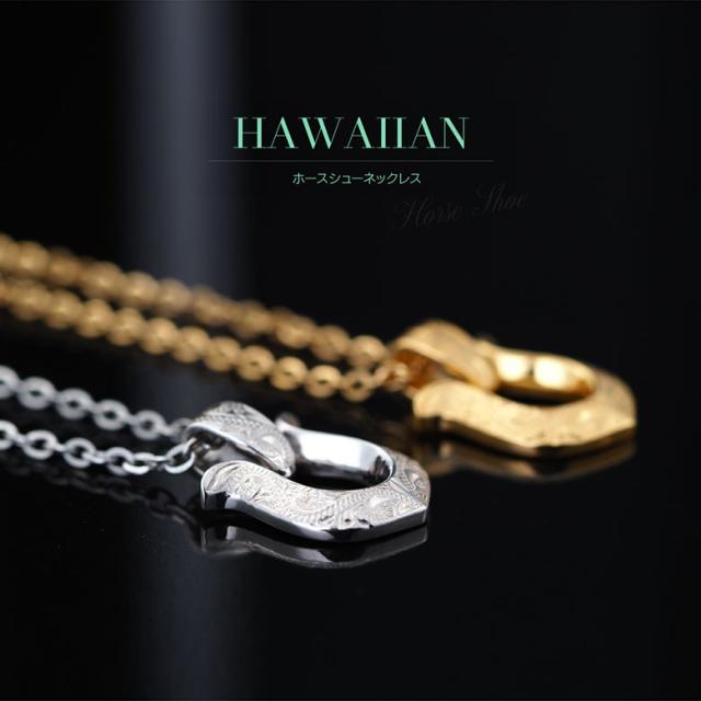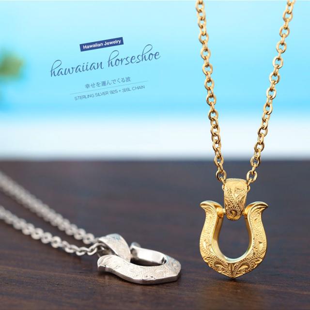 ホースシューモチーフのハワイアンジュエリーネックレスです。ハワイアンジュエリーには珍しい馬蹄(ホースシュー)のデザインで、表面には波模様(スクロール)が彫り込まれています。波模様には幸せを運んでくるという意味が込められており、馬蹄は、古来より幸運を受け止めるといわれています。また、金属アレルギー対策として、首に触れるチェーンはサージカルステンレス316Lを使用。ペンダントトップはステンレスよりも造形が美しく、高級感があるシルバー925を使っています。