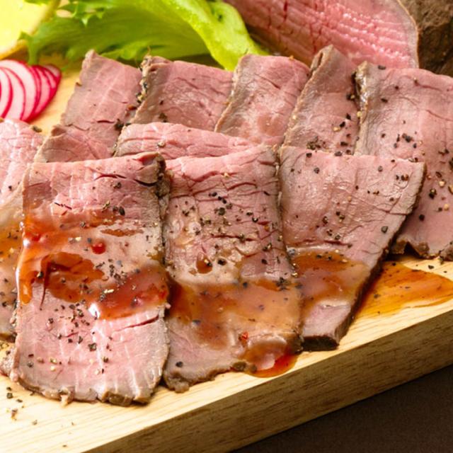 フレンチの鉄人坂井シェフ監修、数種類のスパイスで下味を丁寧に味付けし真空加熱でじっくり焼き上げました。中はしっとりとしたローストビーフです。シェフこだわりのガーリックペッパーソースがお肉の旨みをさらに味わい深く演出します。