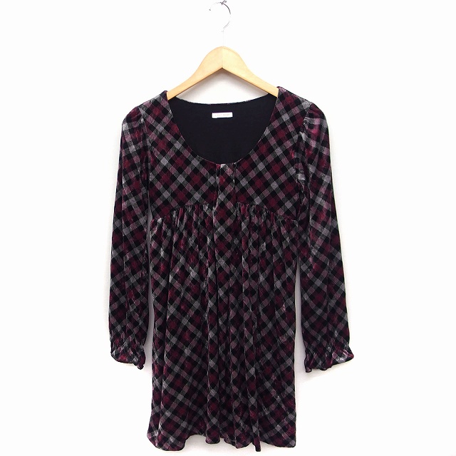 【中古】レストローズ L'EST ROSE チェック フレア ワンピース ひざ丈 長袖 Uネック 2 ピンク ブラック 黒 /FT22