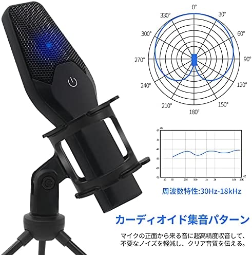 マイク仕様 型式:コンデンサー型 サンプリングレート:48KHZ/16bit 感度:30±3dB(0dB=1V/ Pa atlkhz) 周波数特性:30Hz-18kHz カラー:ブラック 【カーディオイド集音パターン】 このUSBコンデンサーマイクは単一指向性で正面の収音感度が高い、正面約130°の範囲で収音できる、周辺範囲の雑音を低減し、綺麗な音声を再現できます。