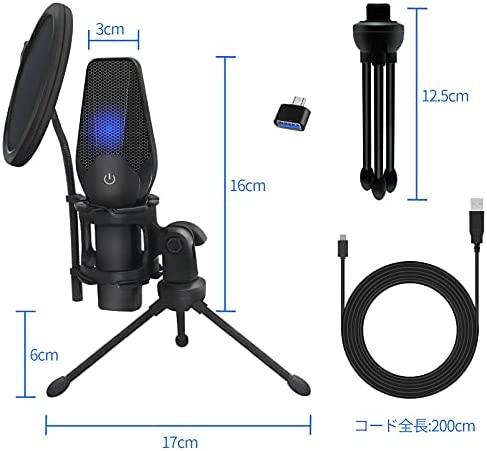 【パッケージの内容】 USBコンデンサーマイク x1 ショックマウント x1 ポップフィルター x1 TYPE-Cアダプタ x1 USBケーブル x1 金属製三脚マイクスタンド x1 日本語取扱説明書 x1 ?【集音力抜群・特殊なノイズ抑制技術】高気密度ポップフィルター付属するので、使うする際には雑音や異物、ホコリ、 唾液の飛散によるマイクの故障を有効に防止できます。