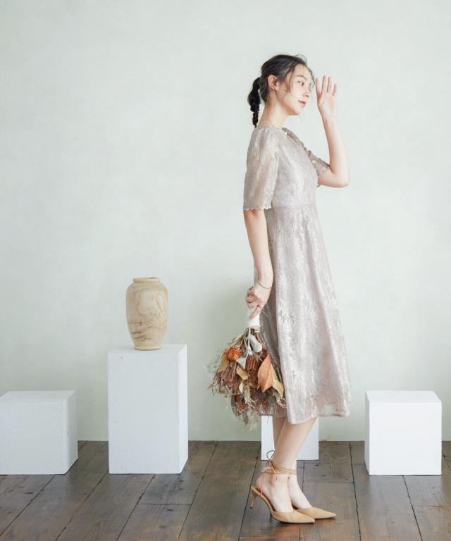 さりげなく二の腕をカバーしてくれる、裾スカラップを施したレース袖が可愛らしい。