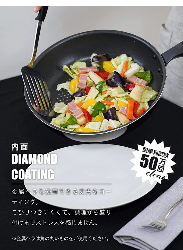 本体:アルミニウム合金、内面:ダイヤモンドコート(ダイキン/シルクウェアEK)、底面:ステンレス鋼