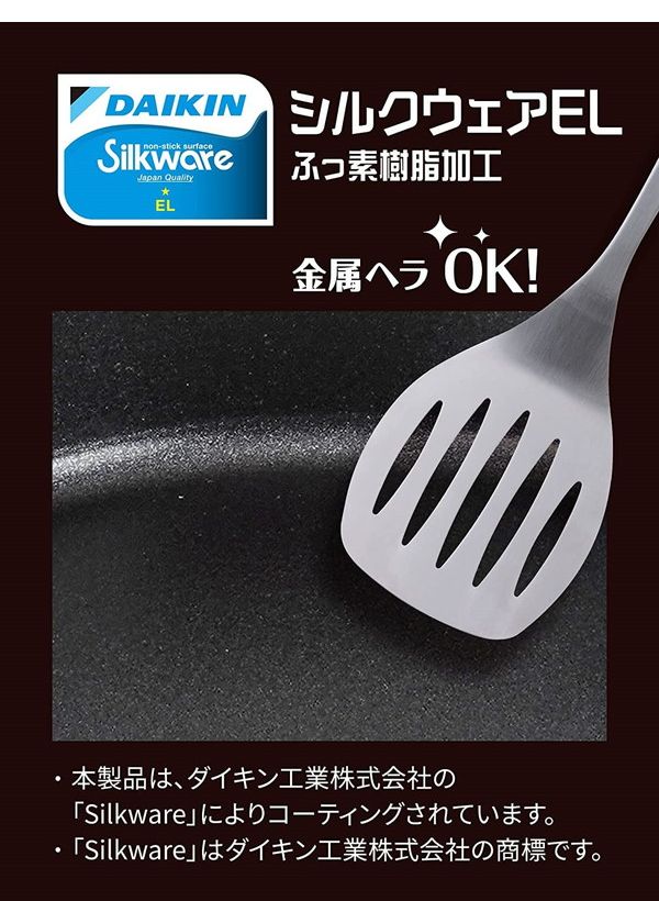 ●内面はこびりつきにくく、金属ヘラが使えるダイキン工業の技術に基づく「シルクウェアEL」ふっ素樹脂加工です。