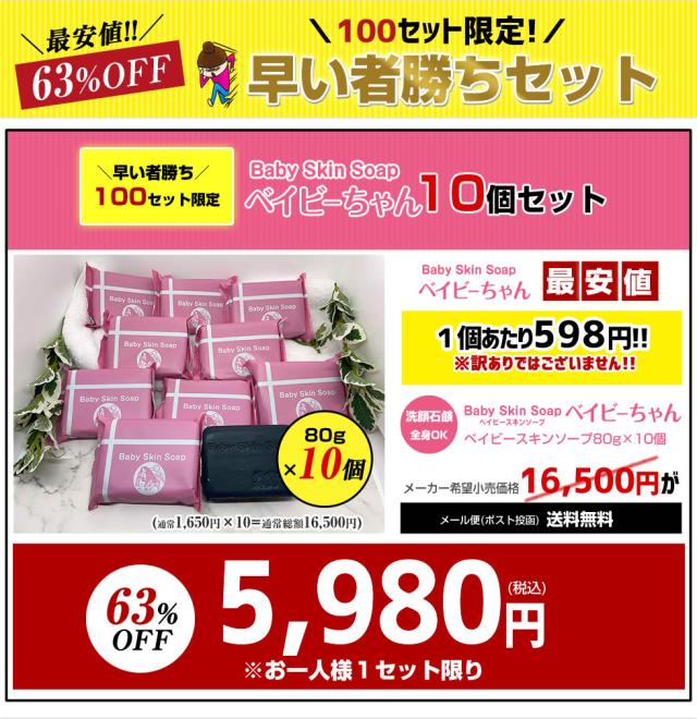 3/1(日)0:00〜【100セット限定★早い者勝ち】63%OFF!「ベイビーちゃん80gx10個」総額16,500円相当⇒5,980円!! ★最安値⇒1個あたり598円★【ベイビースキンソープ 洗顔 洗顔料 ボディーソープ 毛穴ケア 角栓 黒ずみ 角質除去 加齢臭【メール便】