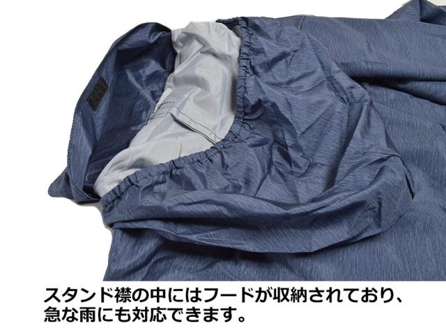 ■スタンド襟には薄手のフードが収納されており、急な雨にも対応出来る。