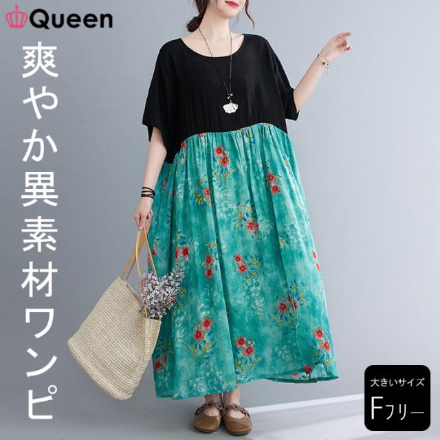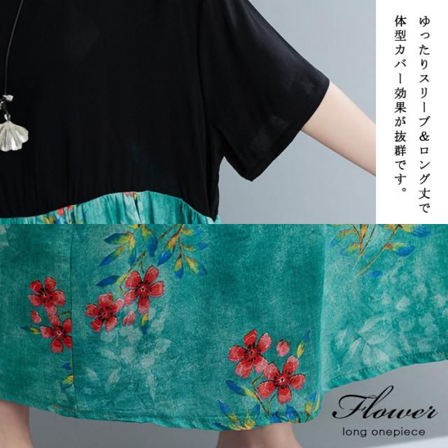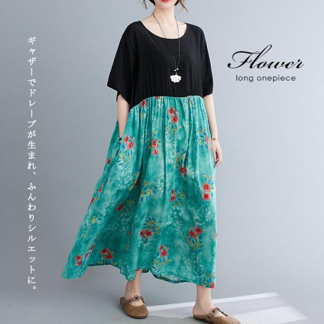 大きいサイズ レディース 切り替えワンピース オーバーサイズ ゆったり 体型カバー 花柄 ロング丈 夏 (66852)