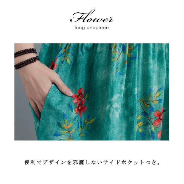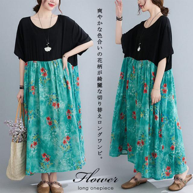 ★☆大きいサイズ レディース 切り替えワンピース オーバーサイズ ゆったり 体型カバー 花柄 ロング丈 夏 LL 3L 4L 5L 6L グリーン 新入荷 メール便可☆★