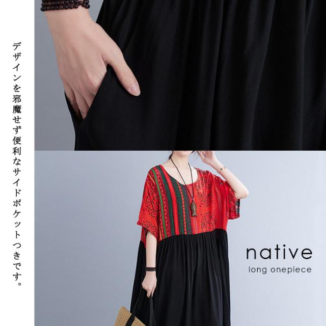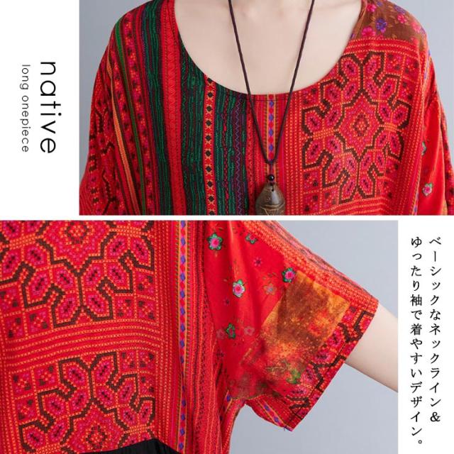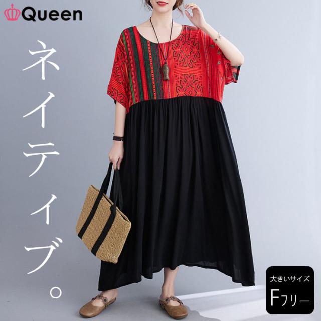 ★☆大きいサイズ レディース 切替ワンピース オーバーサイズ ゆったり 体型カバー ネイティブ柄 ロング丈 黒 夏 LL 3L 4L 5L 6L レッド 新入荷 メール便可☆★