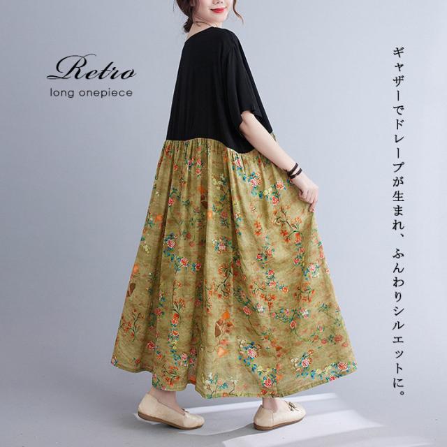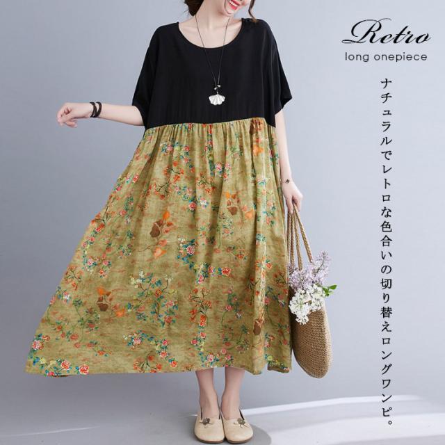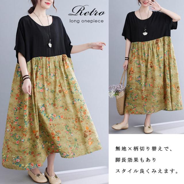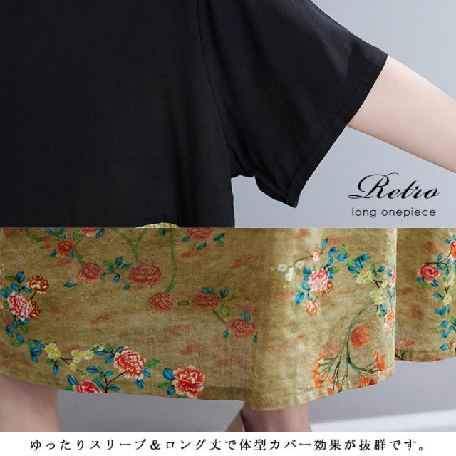 大きいサイズ レディース 切り替えワンピース オーバーサイズ ゆったり 体型カバー 花柄 ロング丈 夏 (66851)