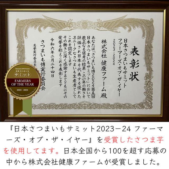『日本さつまいもサミット2023−24 ファーマーズ・オブ・ザ・イヤー』を受賞したさつま芋を使用してます。日本全国から100を超す応募の中から株式会社健康ファームが受賞しました。