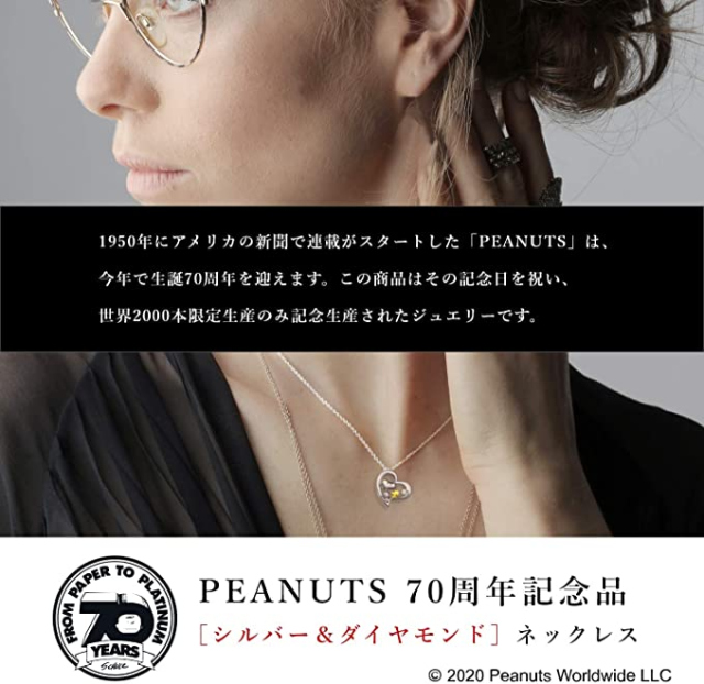 ピーナッツ誕生70周年を記念して作られた特注シルバー925ネックレスに、本物のダイヤモンドをあしらった逸品です。●ピーナッツ生誕70周年記念の大人のスヌーピーアイテム●販売は日本の通販のみの限定プレミアム●純銀の本体に天然ダイヤモンドを配した豪華なデザイン●70周年記念BOXでお届け!
