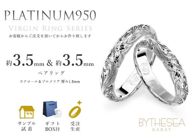 プラチナ ペアリング 2本セット ハワイアンジュエリー 刻印 無料 誕生石入れ可 結婚指輪 マリッジリング 1号〜29号 幅約3.5mm 厚み1.8mm スクロール PT950 白金 ギフトBOX付き 大きいサイズ 小さいサイズ 2個ペア 指輪 カップル プレゼント 【品番:PSR201P】