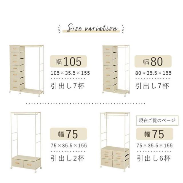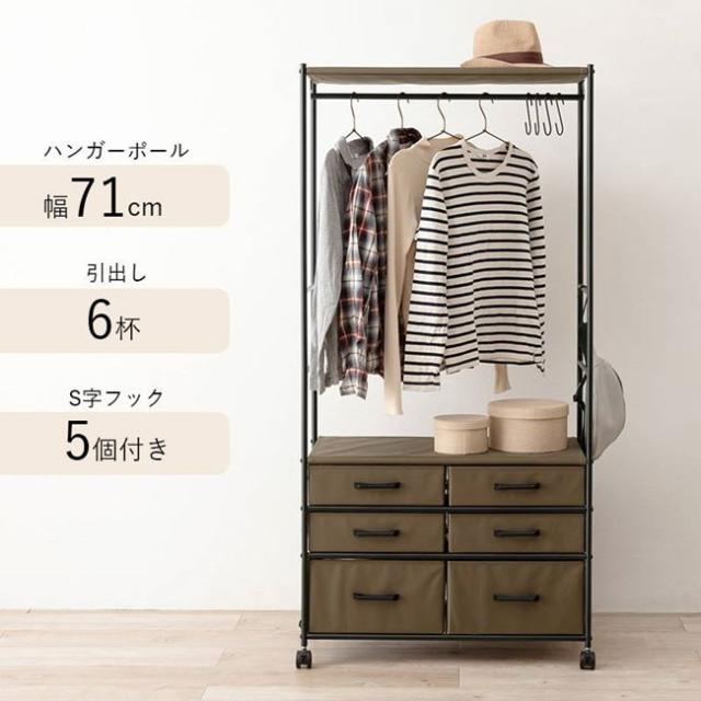 ハンガーラック 引き出し6杯付き コンパクト 幅75cm S字フック5個 キャスター付き