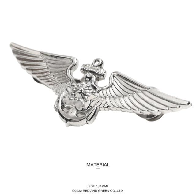 本商品は、海上自衛隊の技能徽章(資格)のひとつで、防衛大臣が指定する講習を修了するとともに、自衛隊における航空士の正規教育課程を修了すれば付与を受け、着用できる銀(乙)の「航空(航空士)徽章/機上整備員徽章」を題材としたオリジナル商品です。