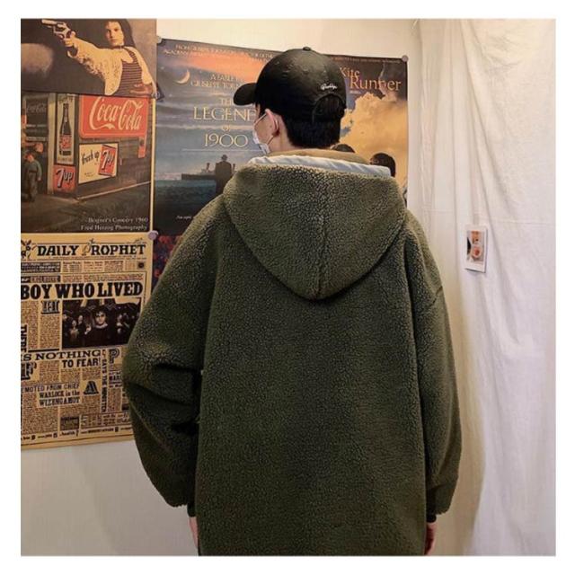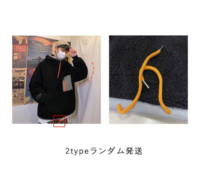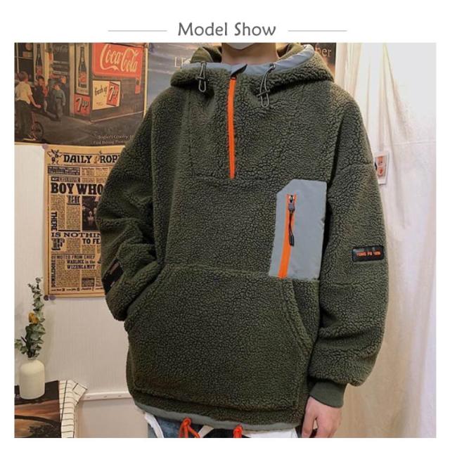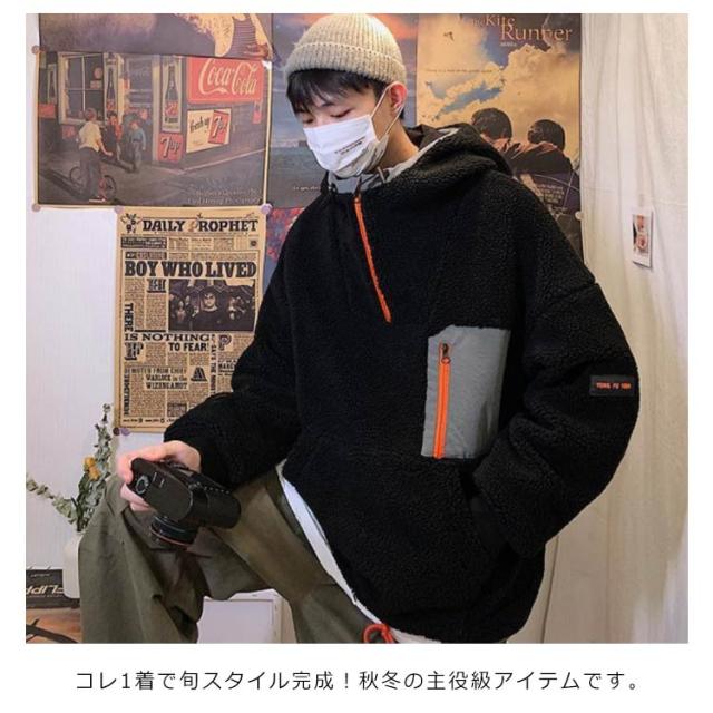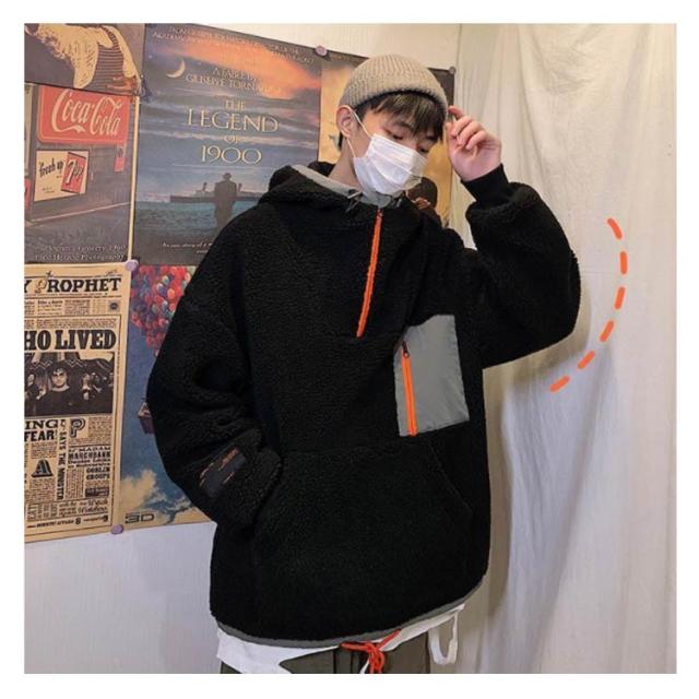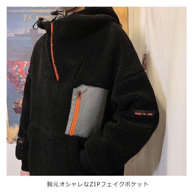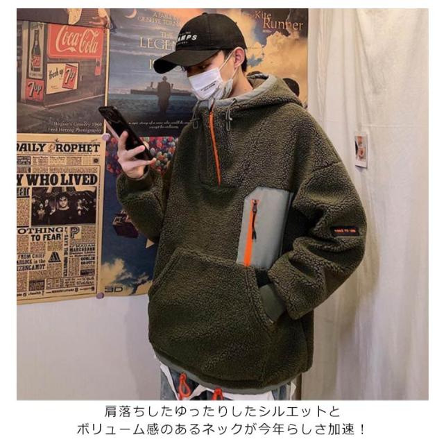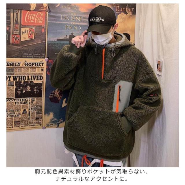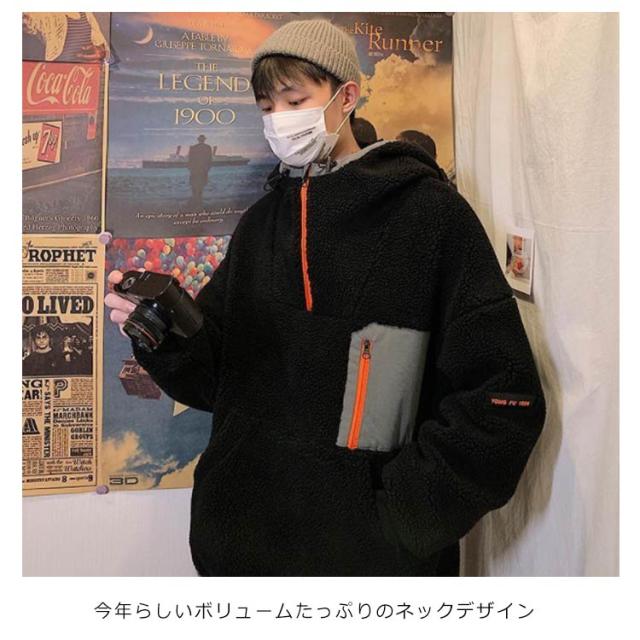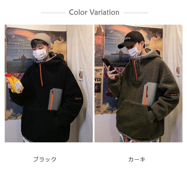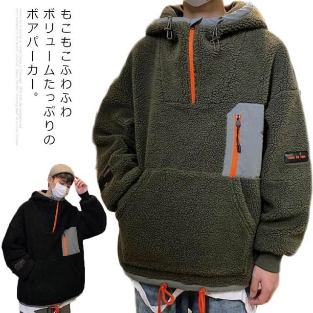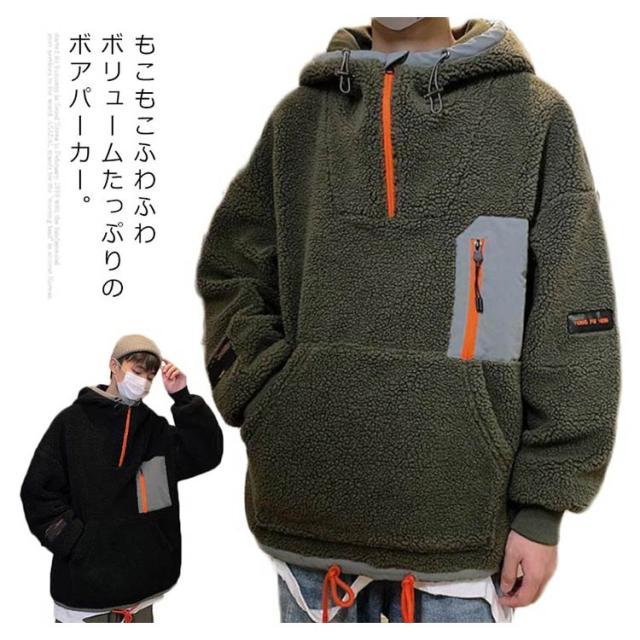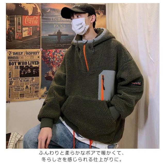 ボアパーカー もこもこ 裏起毛 メンズ ビッグシルエット パーカー プルオーバー 異素材ポケット ハーフジップ ボリュームネック フード付き 秋 冬服 韓国ファッション 大きいサイズ