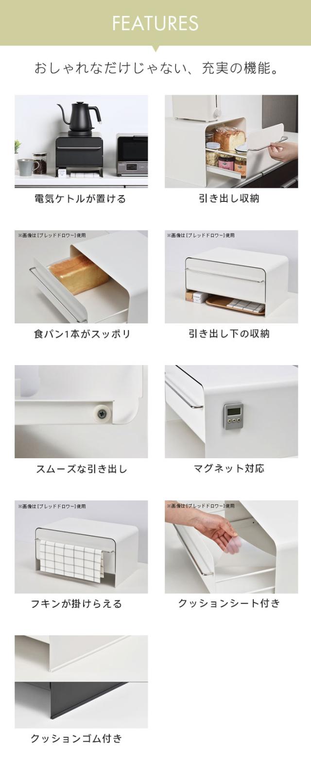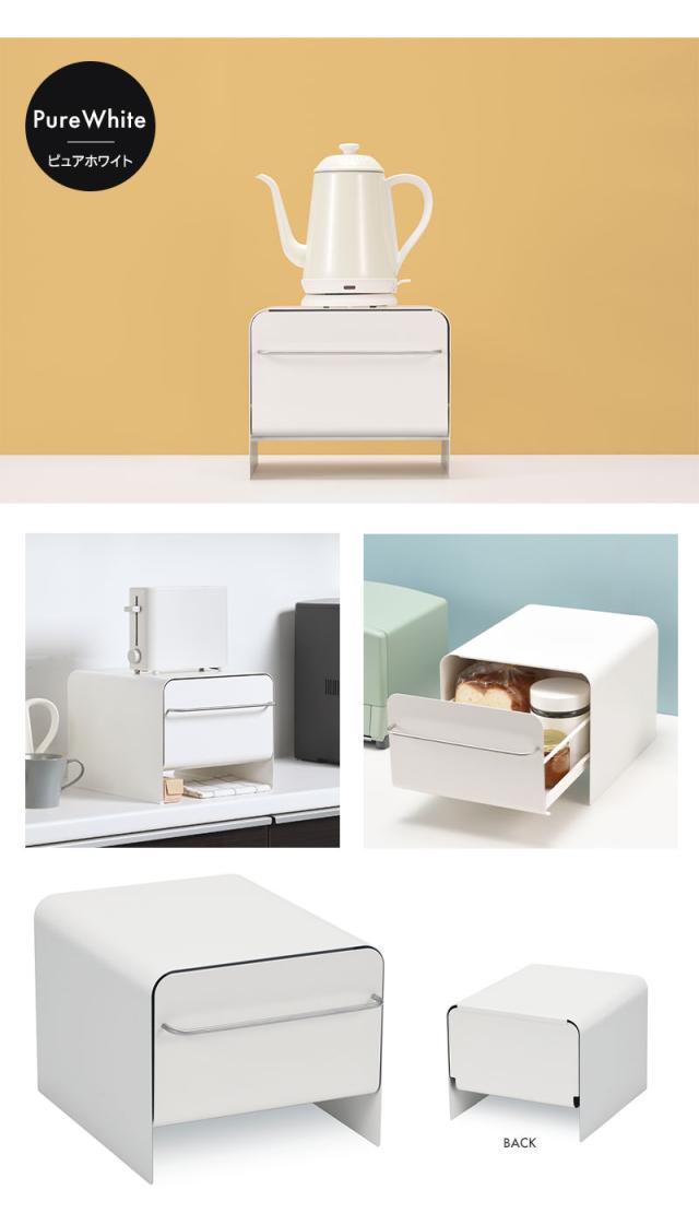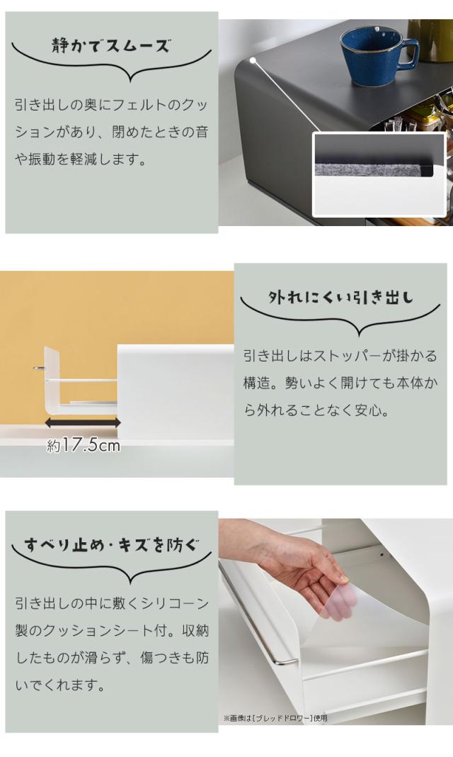 | キッチン周りをスッキリ収納! 上面にはポップアップトースターや電気ケトルが載せられるので今まで置いていたスペースを有効活用できます。 食パンやコーヒー瓶やお菓子など、いろんなものをスッキリ収納できます。 引き出しはローラー付きのレールでスムーズに引き出せ、パッと中身が見渡せて奥の物も取りやすいです。 引き出しを閉めるときは、奥に音を軽減するフェルト製クッションが貼ってあるので、金属のぶつかる音を軽減し、静かに引き出しを閉めることができます。 トレイやラップなどは引き出し下のスペースに収納でき、ステンレス製の取っ手にはフキンが掛けられます。 本体はマグネット対応なのでキッチンタイマーやマグネット式のフックなどつけておいても便利。 引き出し底板の傷付きを防ぎ、中身の滑り止めにもなるクッションシートと、設置場所を保護するクッションゴム付き。 キッチンだけではなく、お部屋や玄関などにも置いて小物などを入れておけます。 爽やかな清潔感のあるピュアホワイトはスッキリとした清々しい空間を演出します。 |