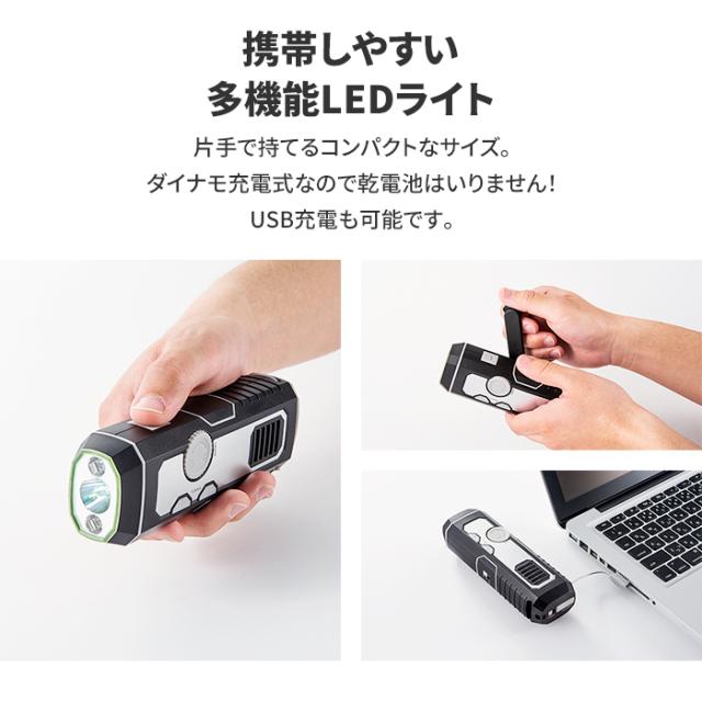 | ラジオ付きポータブルマルチライト ラジオ 災害時 避難用 防災対策 懐中電灯 LED サイレン機能付き FMラジオ AMラジオ ダイナモ充電式 USB充電 |