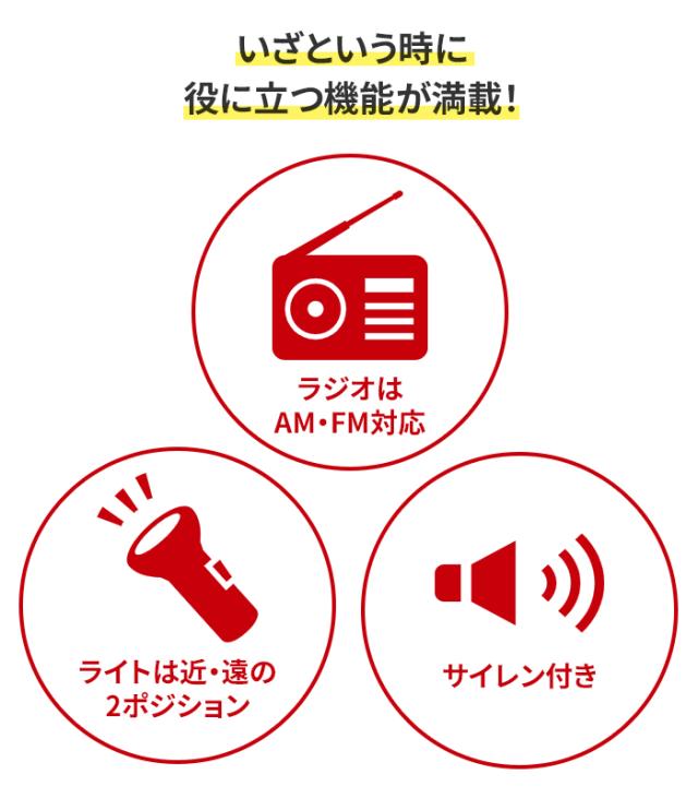| ◇携帯しやすい多機能LEDライト ◇ラジオはAM・FM対応。 ◇ダイナモ充電式で乾電池いらず。 ◇ライトは近・遠の2ポジション。 ◇USB充電も可能。 ◇サイレン付きでいざという時にも役立つ。 |