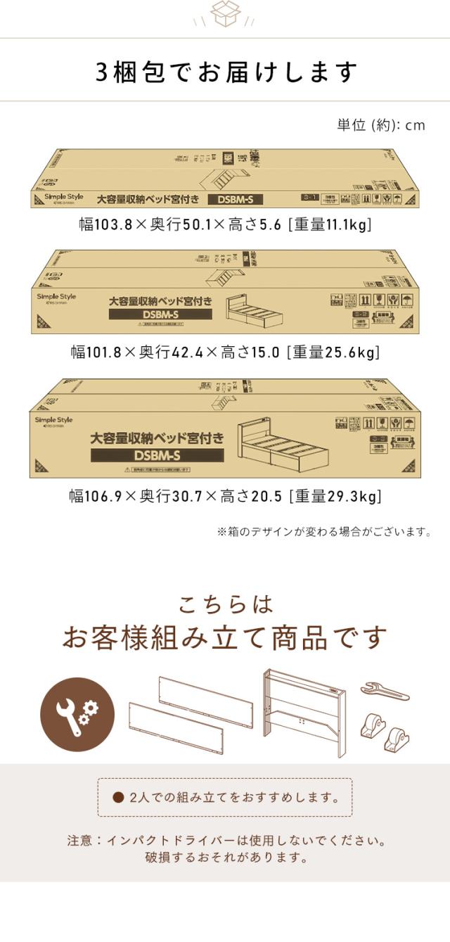 ヘッドボード天板:約5kg、本体:約100kg、引出:約10kg(1個あたり)、全体:約125kg