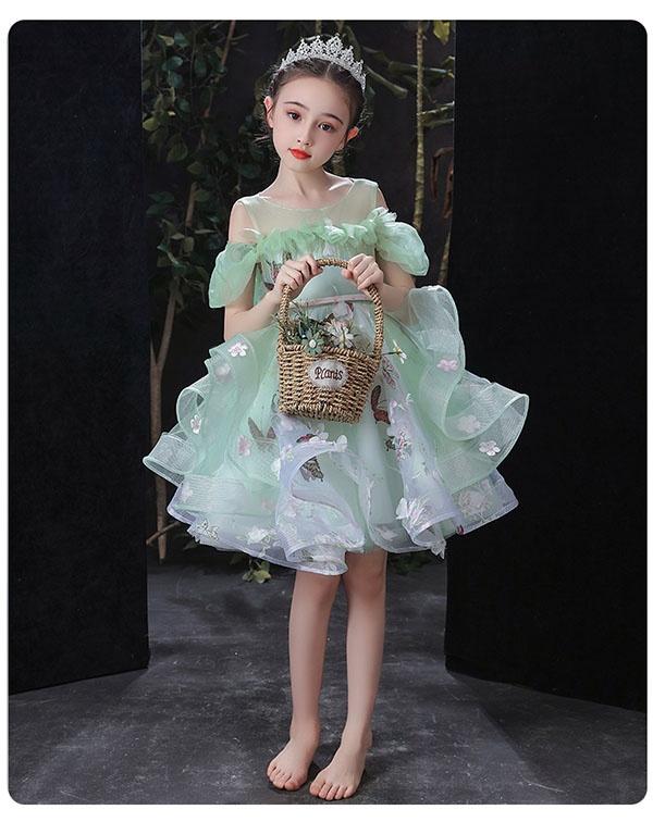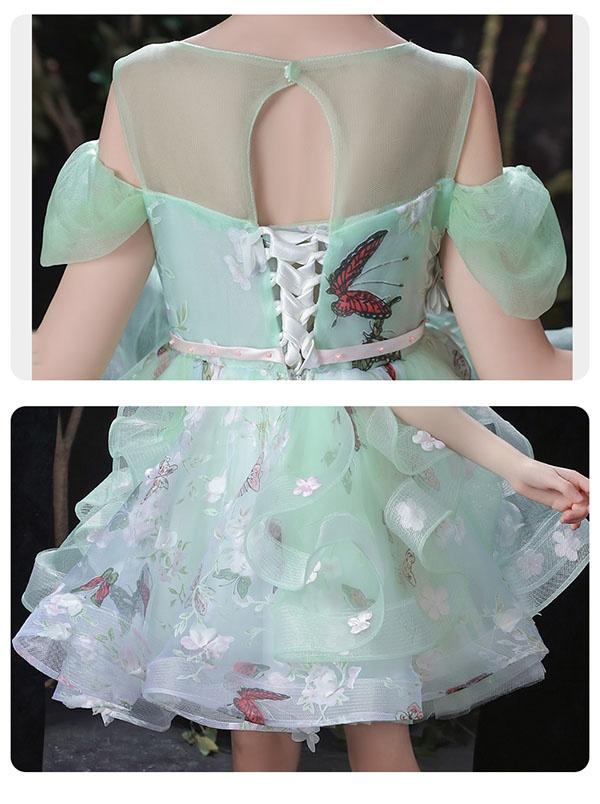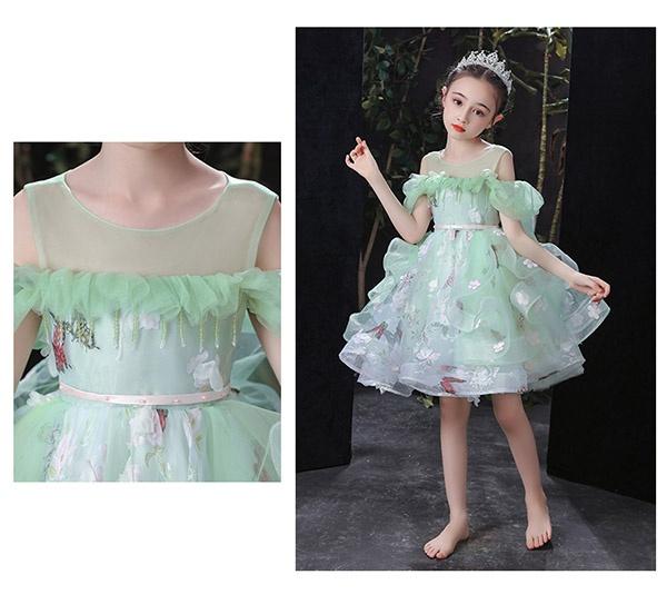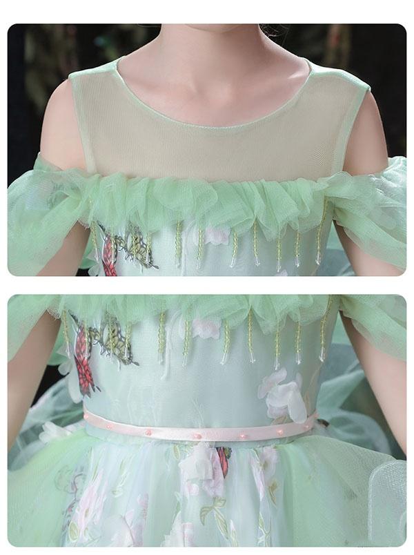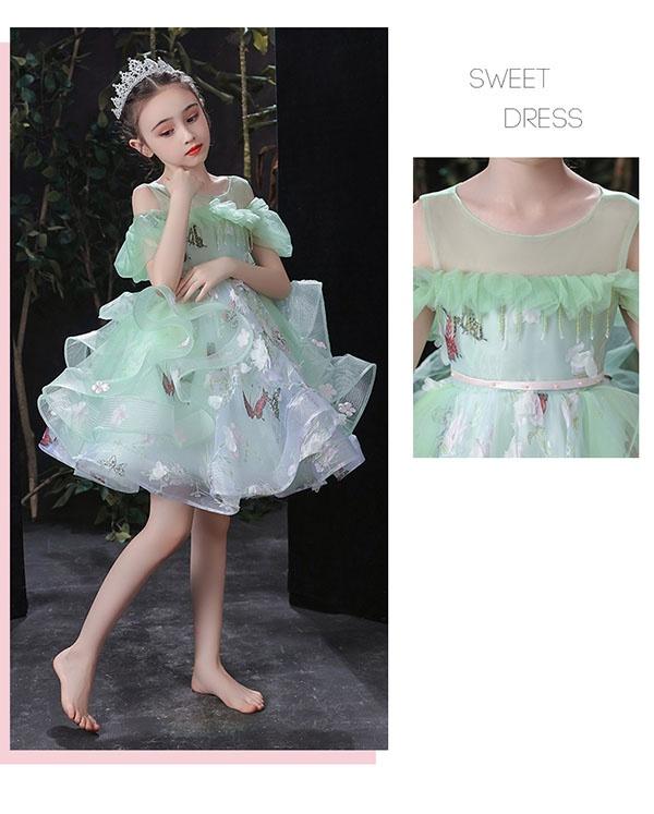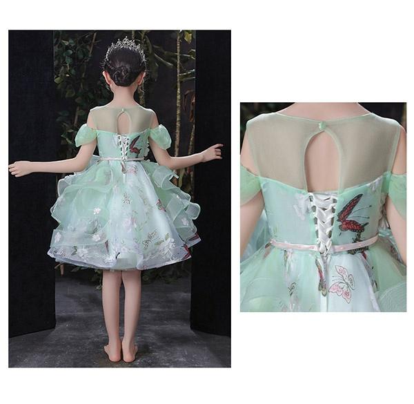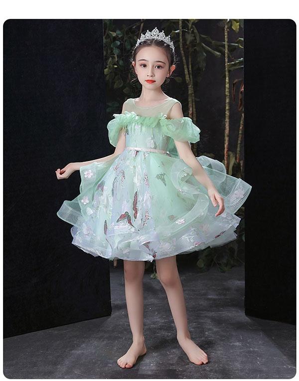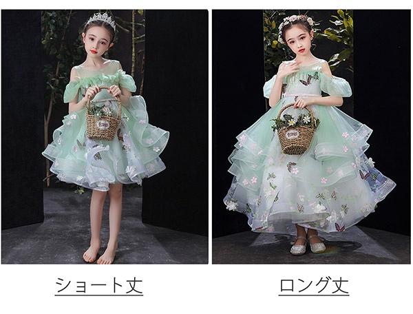キッズ ドレス 蝶々柄 花柄 ピアノ発表会 ワンピース 女の子 袖あり ロングドレス 子供ドレス 演奏会 グリーン 編み上げタイプ キッズドレス 上品