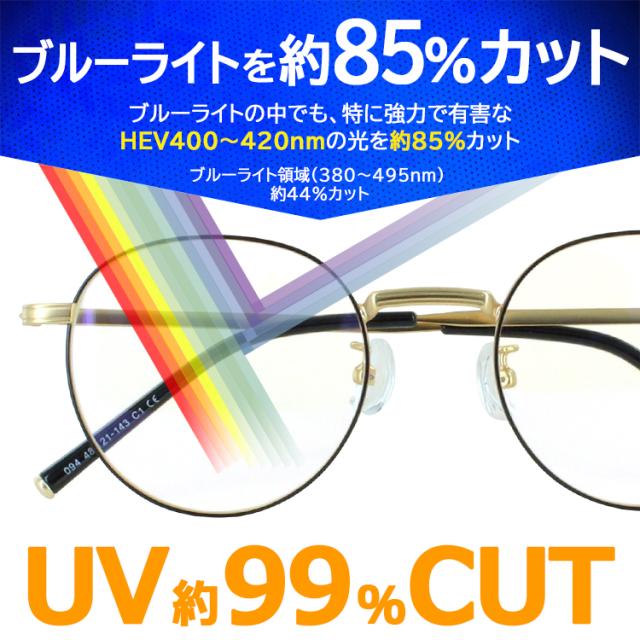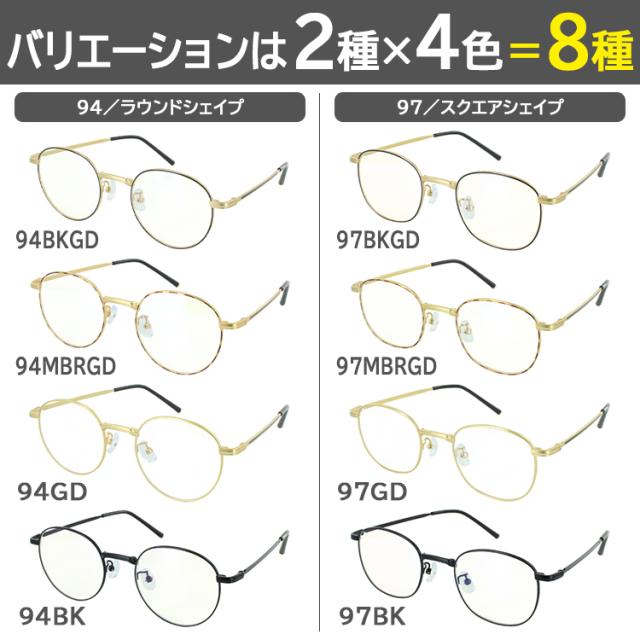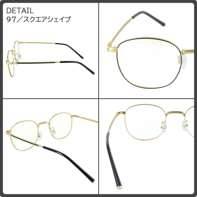| ●フレームカラー 94/ラウンドシェイプ 94BKGD ブラックゴールド 94MBRGD マーブルブラウンゴールド 94GD ゴールド 94BK ブラック 97/スクエアシェイプ 97BKGD ブラックゴールド 97MBRGD マーブルブラウンゴールド 97GD ゴールド 97BK ブラック ●レンズカラー クリア | ●素材 レンズ枠素材:メタル合金 テンプル素材:メタル合金 レンズ素材:プラスチック ●仕様 可視光線透過率:93% ブルーライト領域380nm〜500nmの 平均カット率:44% HEV400〜420nmのカット率:約85% 450nm付近のカット率:約19% |