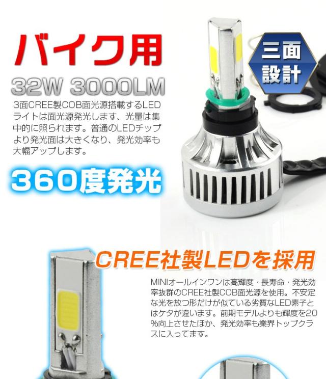 最新改良型 32W最新モデル3000LM 三面設計 MiNi バイク用LEDヘッドライト6000K H4 H4R1 PH7 PH8 H/L 冷却ファン内蔵モデル 1年保証