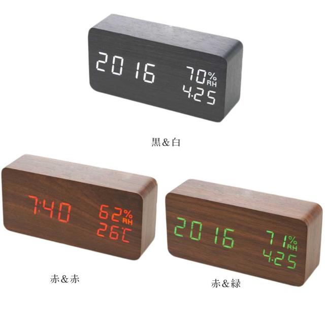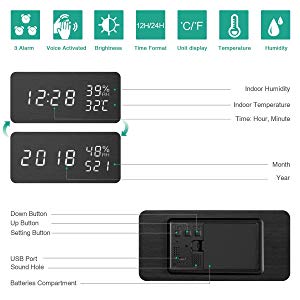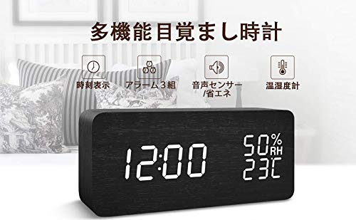 【多機能】:12H制/24H制 温度 湿度 アラーム3組 音声感知/常時点灯 明るさ3段階調節 電源切れた時も設定記憶 省エネモード