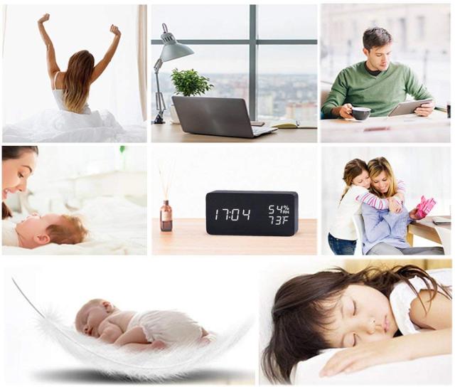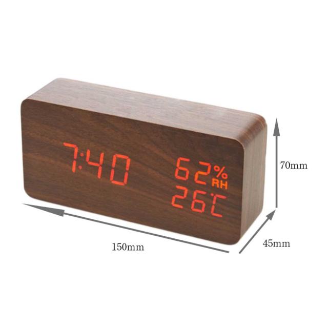 目覚まし時計 大音量 デジタル 木製 置き時計 温度湿度計 木目調デジタル 置き時計 大きなLED数字表示 アラーム 多機能 カレンダー付き 省エネ 音声感知 電池 ナチュラル風