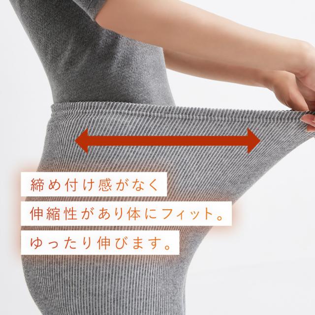 生地全体に高い伸縮性があり、よく伸びて動きやすく、締め付け感の少ないやさしいはき心地。ウエストやお腹まわりに無理なくフィットするので、座った姿勢や家事の動作もらくらくです。おうちでのくつろぎ時間や就寝時にもぴったり。