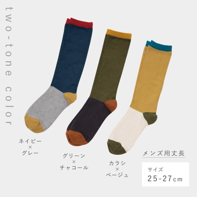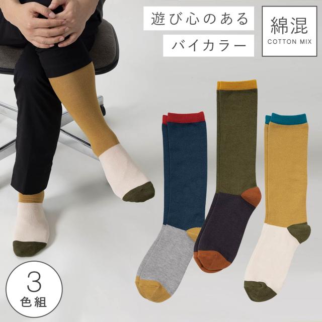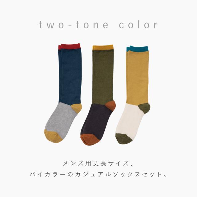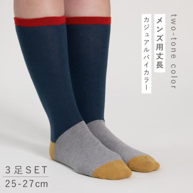 靴下 メンズ 3色組 25-27cm バイカラー オシャレ 丈長 メンズカジュアル丈長ソックス