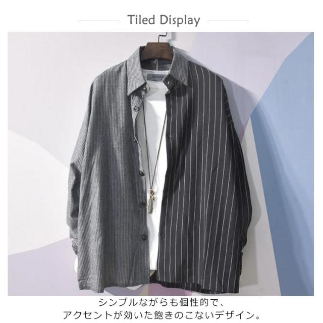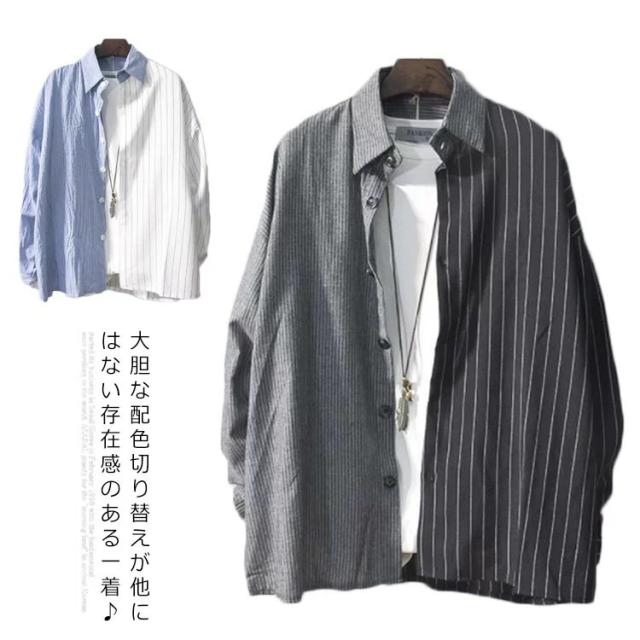カジュアルシャツ バイカラー 配色 切り替え ストライプ メンズ 長袖 ワイシャツ 長袖シャツ トップス 春新作 夏 秋 冬 アメカジ ストリート系
