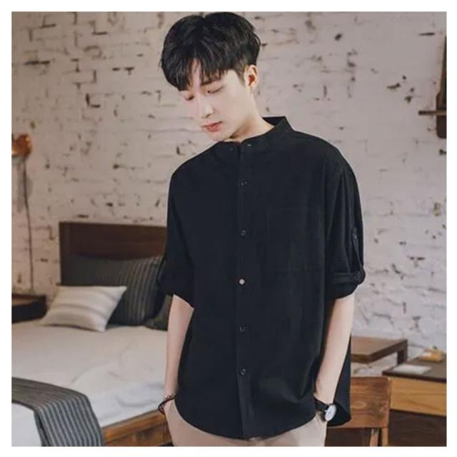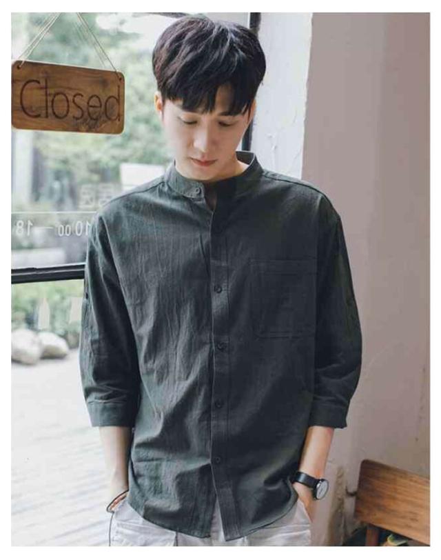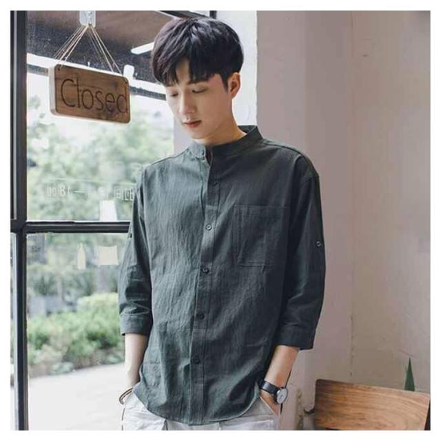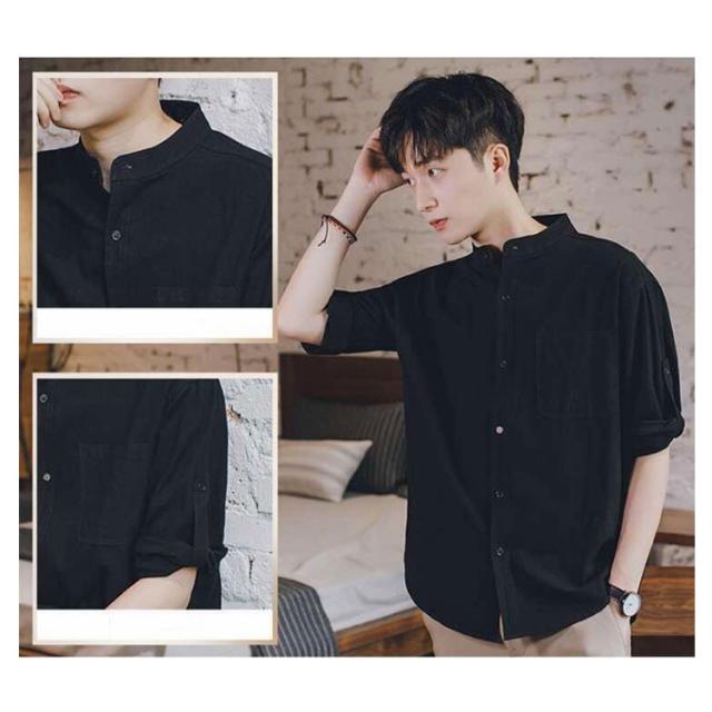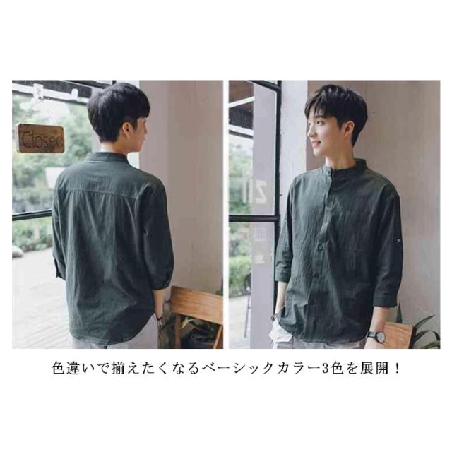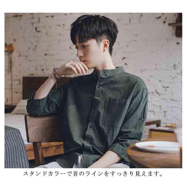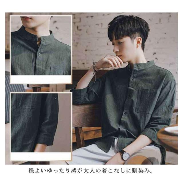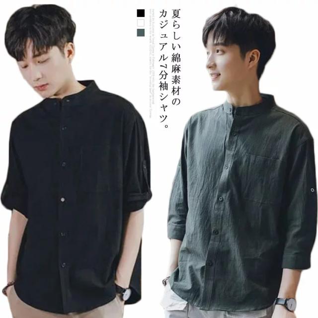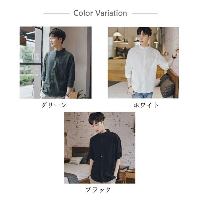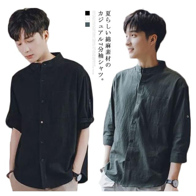 リネンシャツ メンズ 七分袖 シャツ 綿麻シャツ カジュアルシャツ リネン 綿麻 コットン リネン スタンドカラー トップス 薄手 袖ロールアップ 立ち襟 春服 夏服 春 夏 無地 清涼感 シンプル カジュアル きれいめ シンプル ナチュラル グリーン ブラック ホワイト