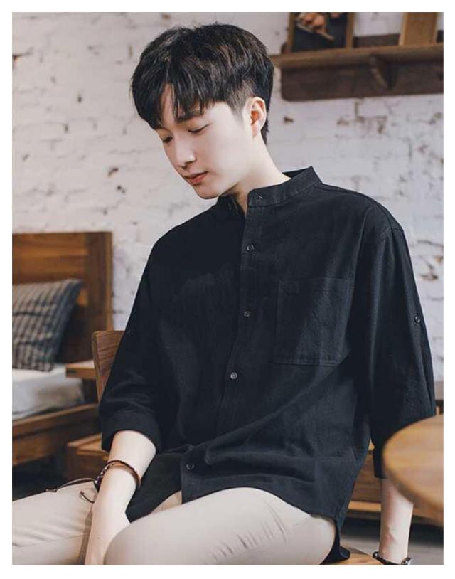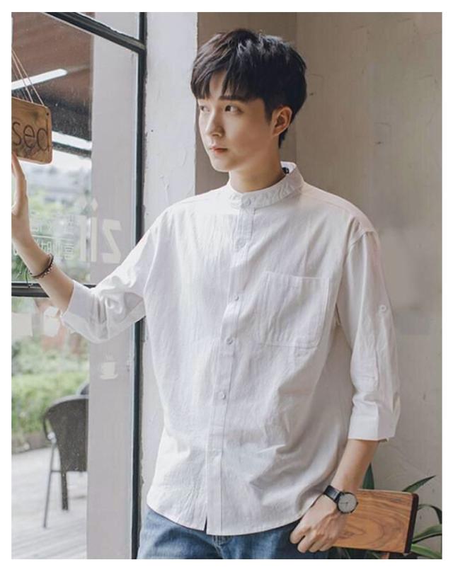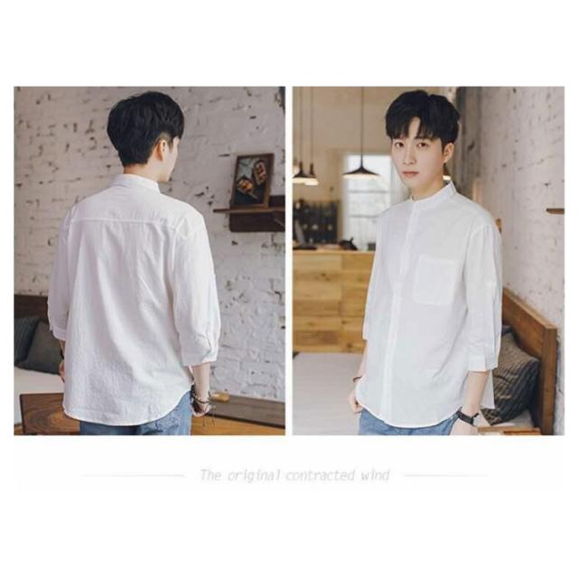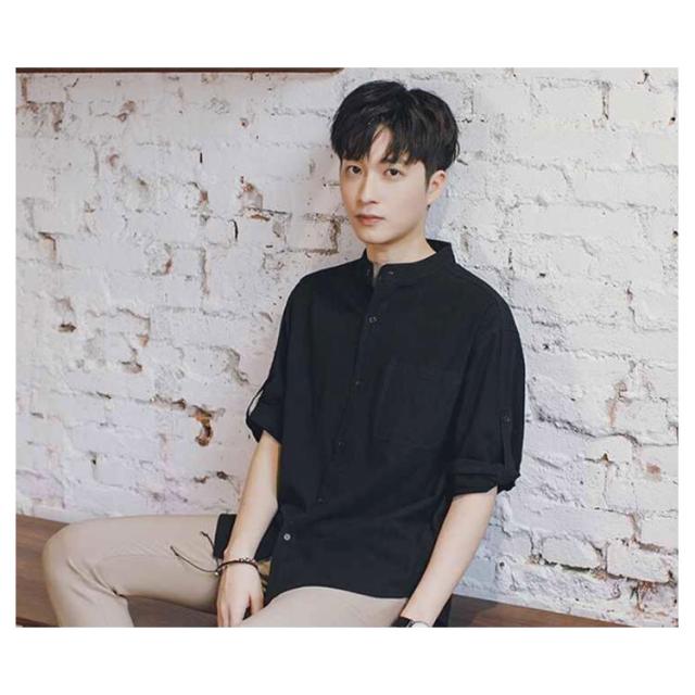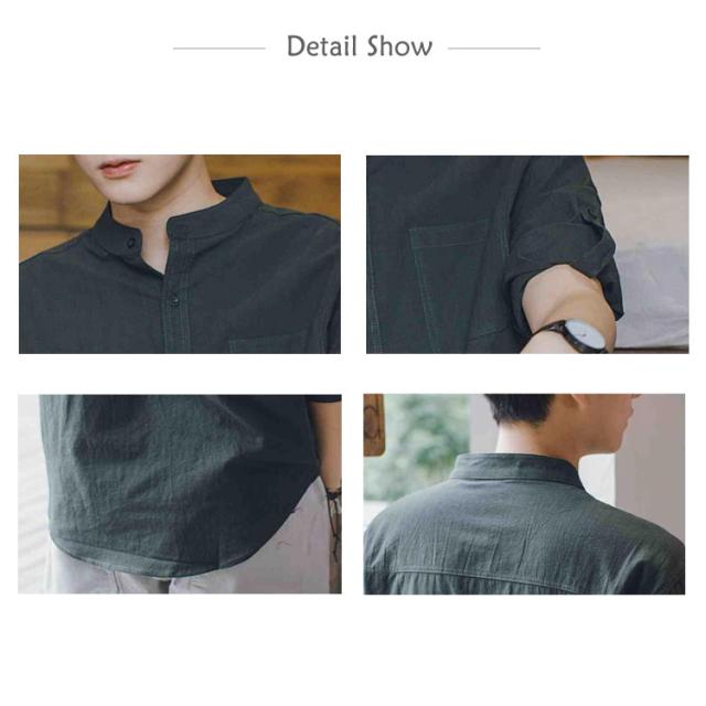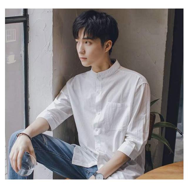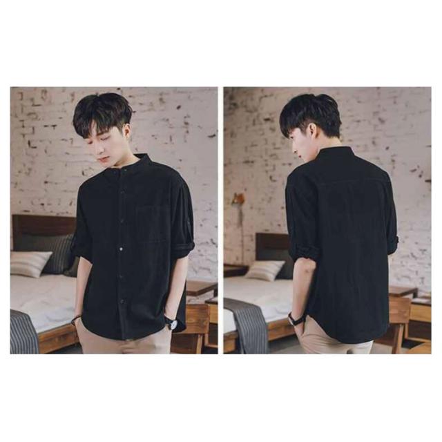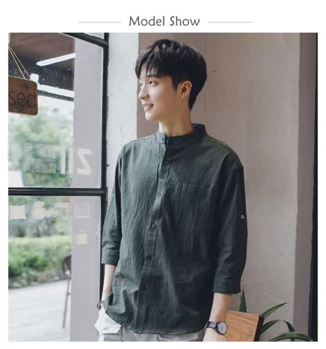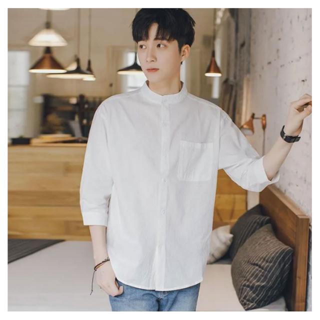 リネンシャツ メンズ 七分袖 シャツ 綿麻シャツ カジュアルシャツ リネン 綿麻 コットン リネン スタンドカラー トップス 薄手 袖ロールアップ 立ち襟 春服 夏服 春 夏 無地 清涼感 シンプル カジュアル きれいめ シンプル ナチュラル グリーン ブラック ホワイト