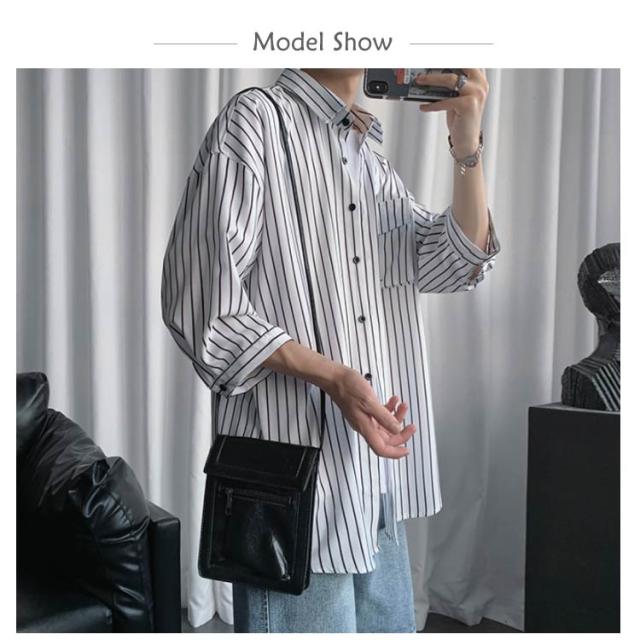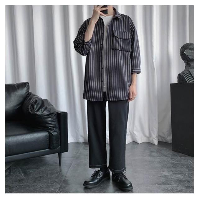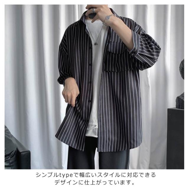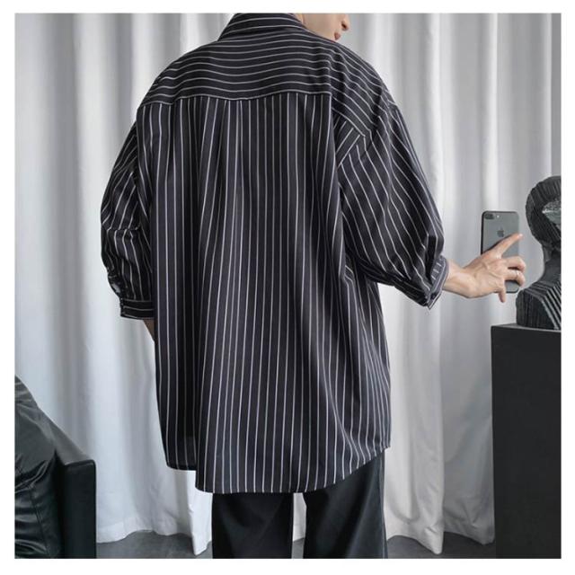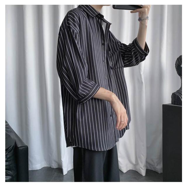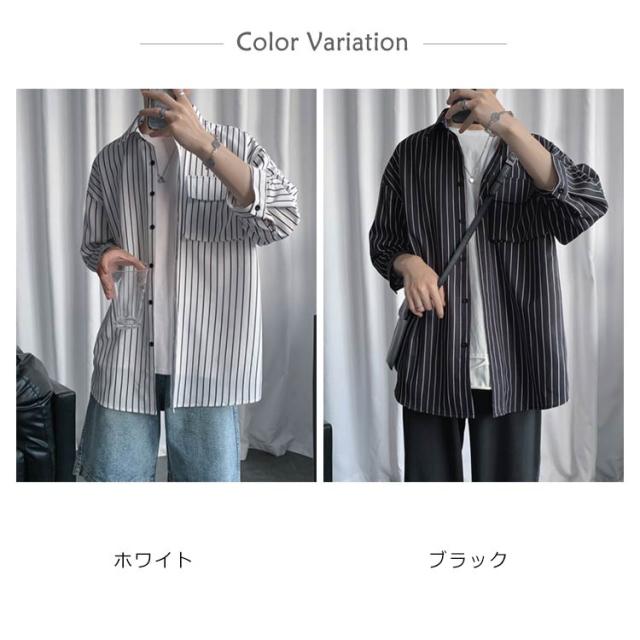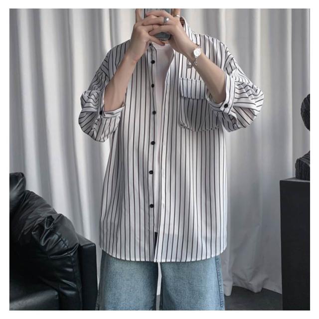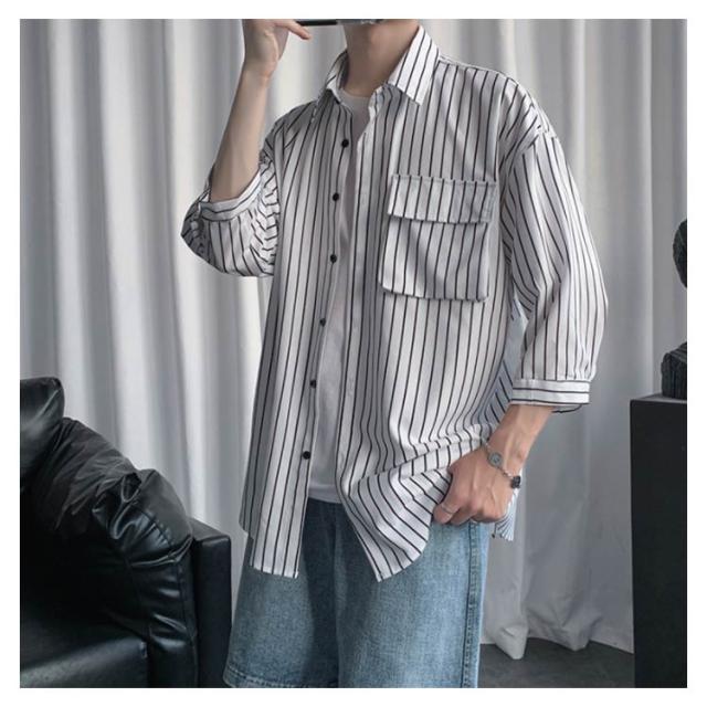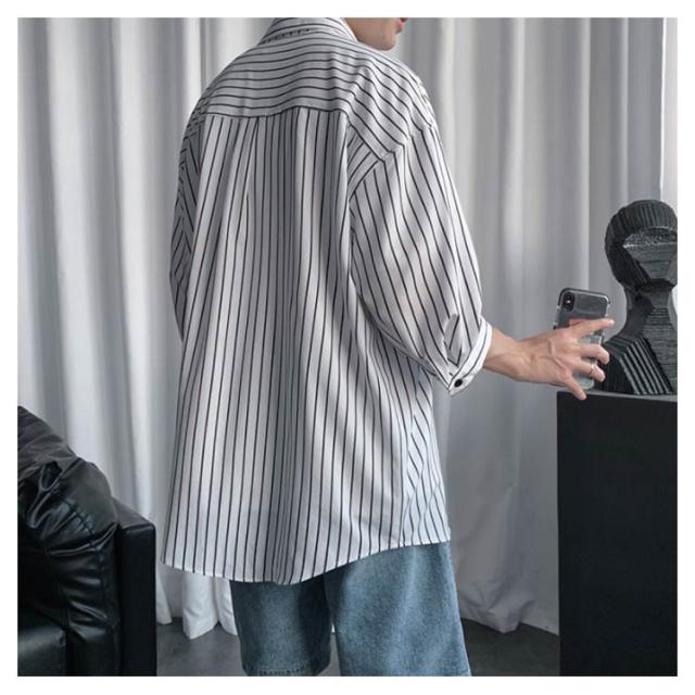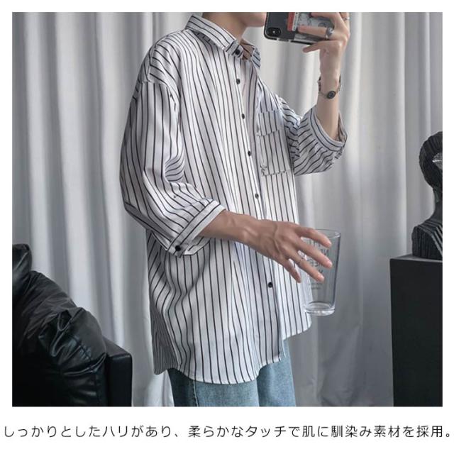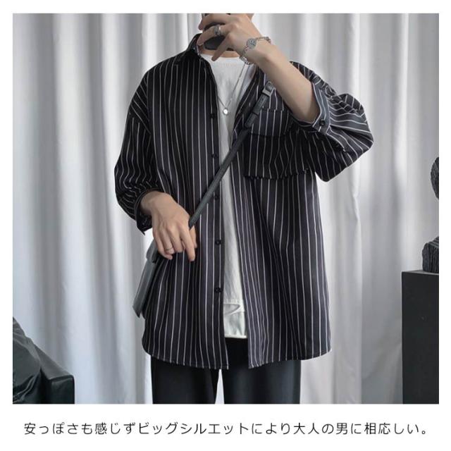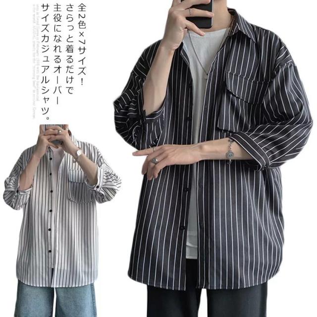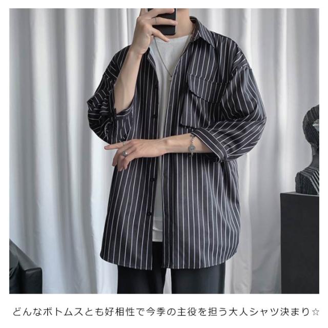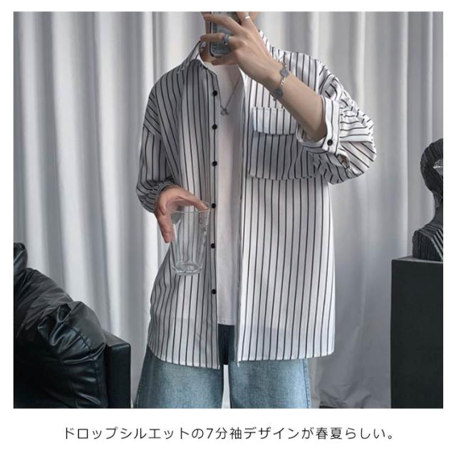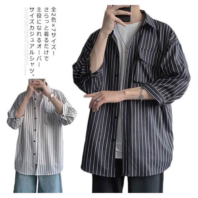 全2色×7サイズ!ストライプ柄シャツ ビッグシルエット シャツ メンズ 七分袖シャツ 大きサイズ カジュアルシャツ 7分袖 トップス 羽織り ゆったり オーバーサイズ お洒落 夏服 夏 夏物