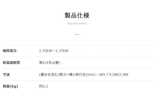 | 暖房出力 | 最大:2.5kW 最小:1.25kW |