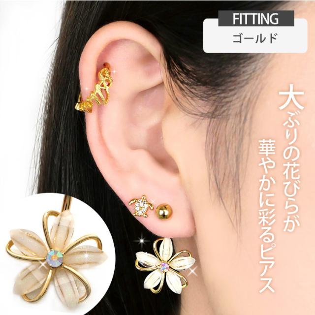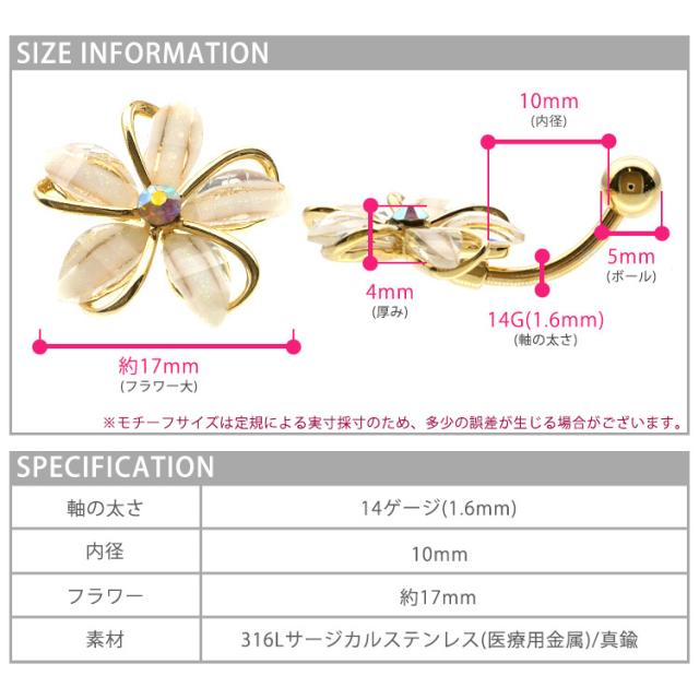 華奢な線が描くフラワーモチーフが大人可愛い。花びらにラメが入っていて美しいデザインです。太さのサイズは一般的なへそピアスに使用させる14Gサイズです。軸とボール部分は、金属アレルギーの方や、 お肌が敏感な方にも安心してお使いいただける、サージカル(医療用)ステンレス素材です。シルバーモチーフは真鍮にロジウムコーティング施しております。ゴールドモチーフとローズゴールドモチーフは真鍮に14Kゴールドコーティング施しております。