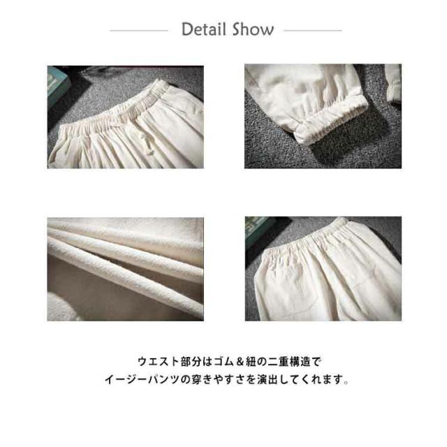 | 全6色×7サイズ!味わい深い綿麻の風合い。 大人男性も着たくなる綿麻イージーパンツのお見え! ゆったり感が心地いいサルエル風でヒップや太もももしっかりとカバーできます。 ウエスト部分はゴム&紐の二重構造でイージーパンツの穿きやすさを演出してくれます。 長すぎない9分丈なので、すっきりとした足首に仕上がり。 体形を気にせず気軽に穿くだけで、春夏のオシャレ上級者コーデになるのもポイントです!! | |