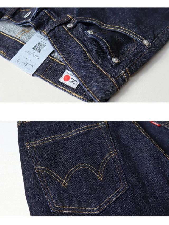 【素材】 経糸は三本精紡交撚糸を使用し、毛羽の無く光沢のある濃色インディゴ染を採用、緯糸にはEDWINジーンズの生産工程で出される「裁断クズ」やお客様から回収された不要になったジーンズを反毛し作られたオリジナルのストレッチ糸採用しました。EDWIN503のコンセプトにサスティナブルをプラスしたデニム素材です。