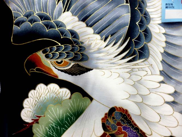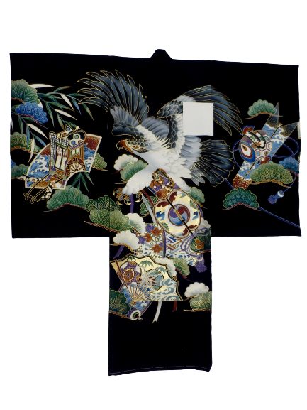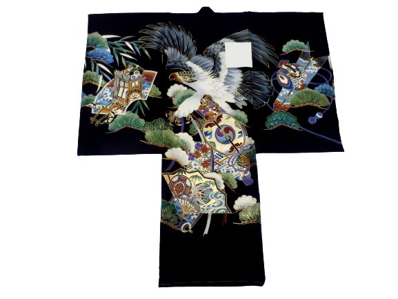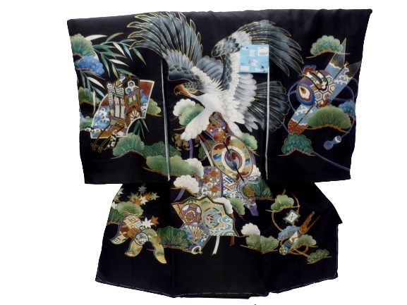 お宮参り 初着 男の子 産着 着物 一つ身 お祝い着 赤ちゃん 正絹 黒地 鷹 扇子 柄No.5