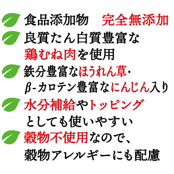 ワンちゃんが大好きな鶏むね肉をパピーからシニアまで与えやすいペーストタイプに仕上げました。水分補給やトッピングとしても使いやすい!穀物不使用なので、穀物アレルギーにも配慮。鉄分豊富なほうれん草・β-カロテン豊富なにんじん入り。食品添加物完全無添加。グレインフリー(原材料として穀物不使用)、食品添加物完全無添加