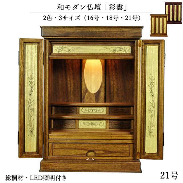 職人技光る・和モダン仏壇【彩雲21号 ミドルブラウン色】LED照明付き・総桐材・軽い・伝統型仏壇・上置き小型仏壇 送料無料
