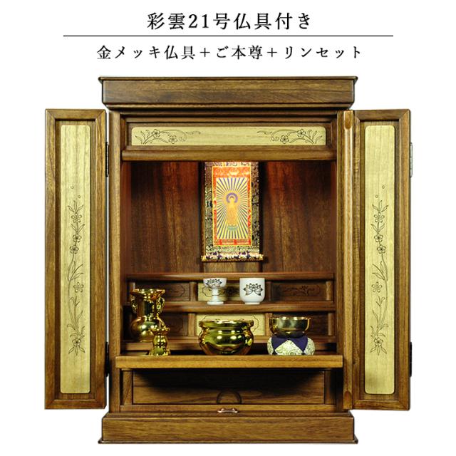 仏具付き・和モダン仏壇【彩雲21号 ミドルブラウン色】【金メッキ仏具+御本尊+リンセット)LED照明付き・総桐材・伝統型仏壇・送料無料