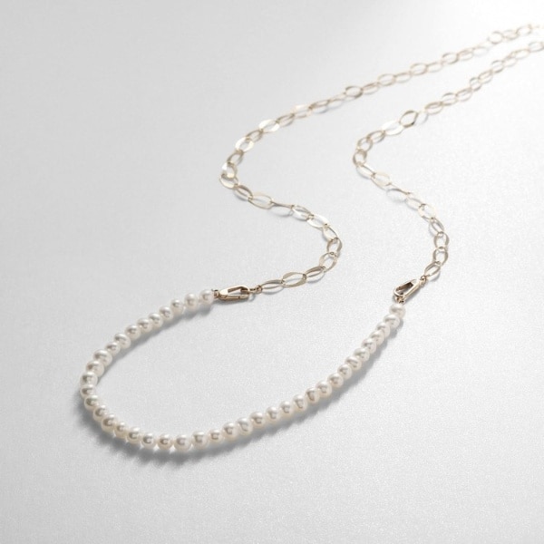 ボリューム感のあるデザインチェーンと連続したパールのジュエリーは、繋げても分けてもトレンド感のあるコーディネートが楽しめます。